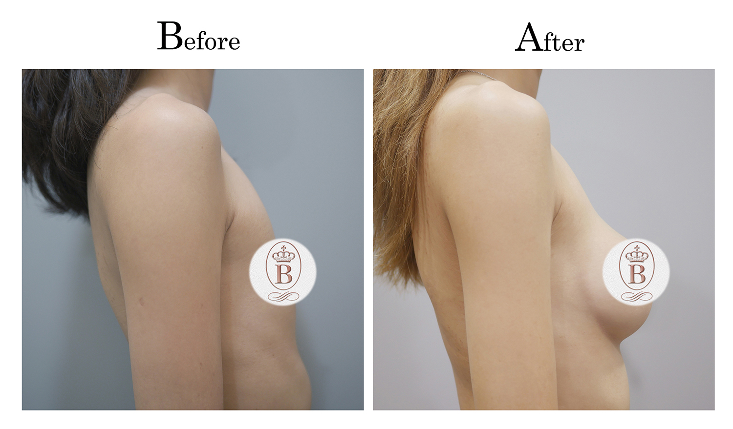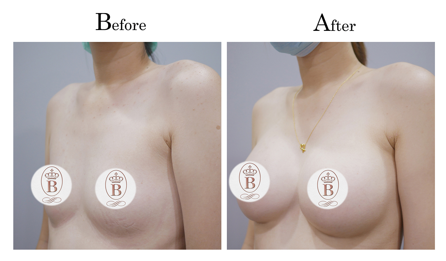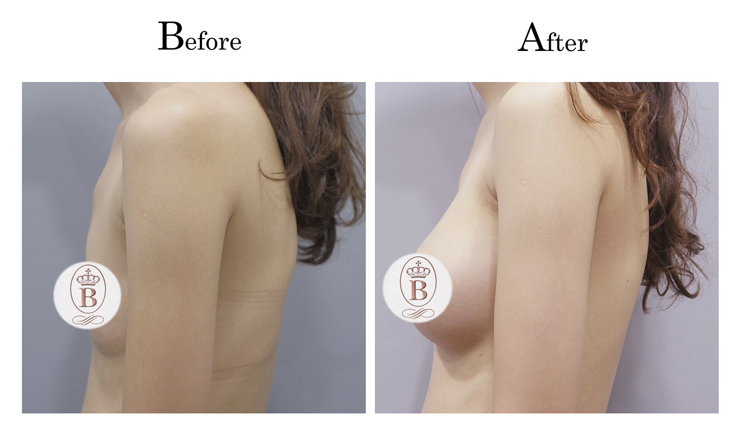 此案例本身條件屬於A罩杯,病患一直夢想希望到E罩杯,但又不希望感覺太OVER,另外也不想要術後一直按摩,因此選擇屬於比較自然術後也不需按摩的水滴型果凍矽膠隆乳,此次手術從腋下植入,因此從外觀看不到傷口,腋下的切口癒合後藏在皺褶中,也不容易看出。