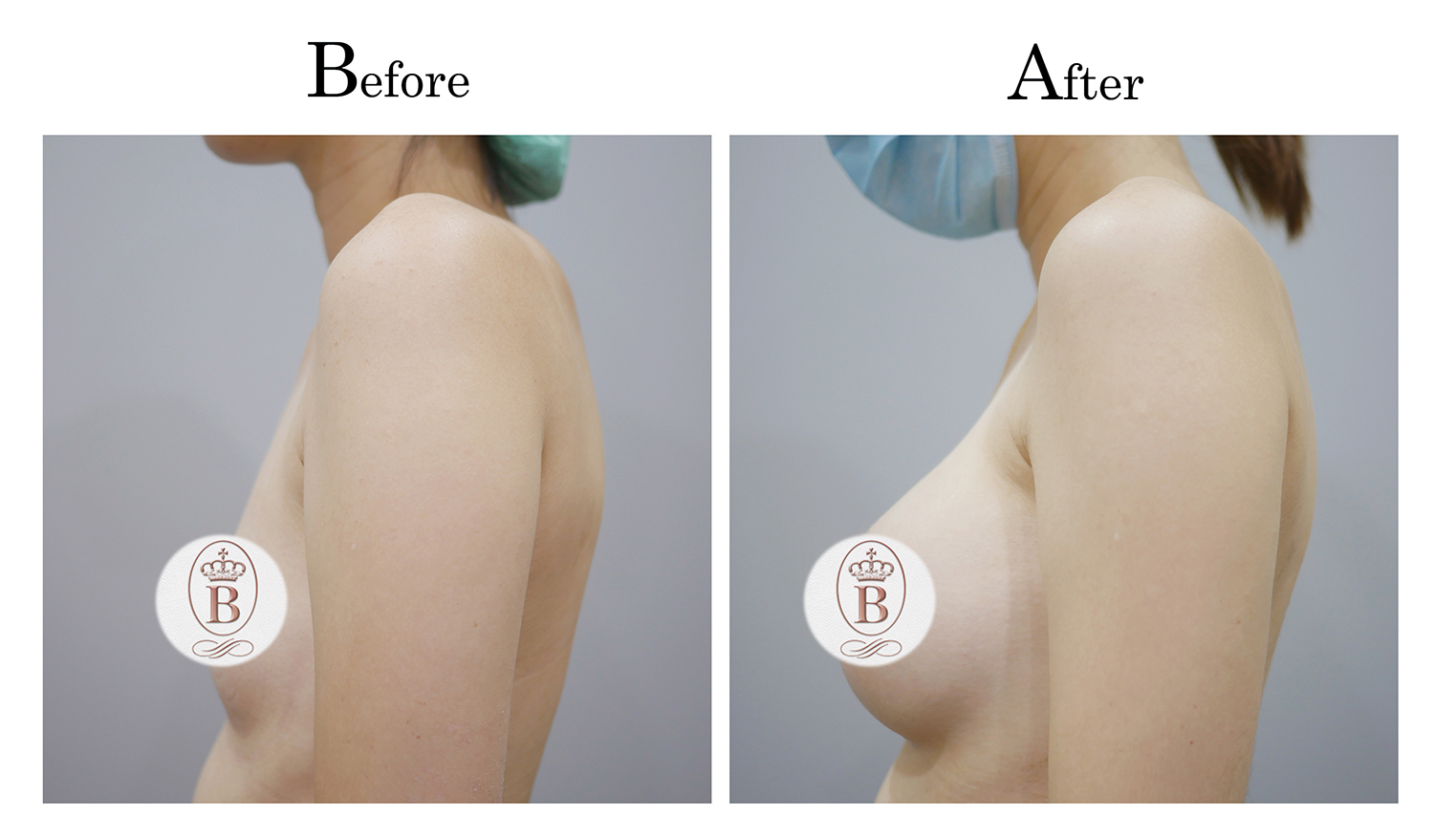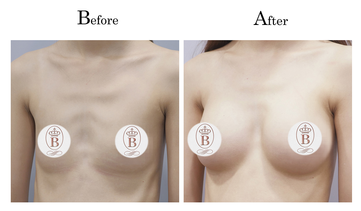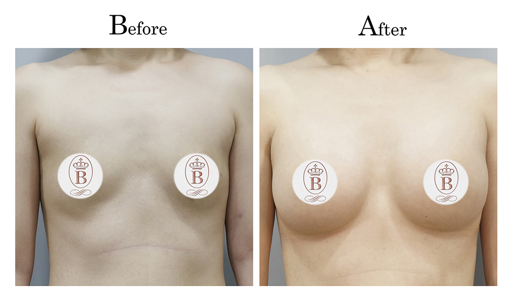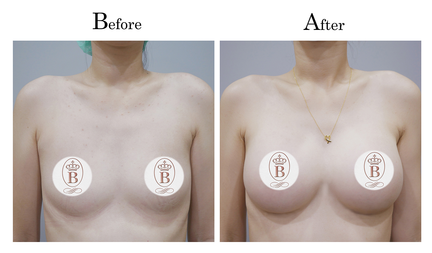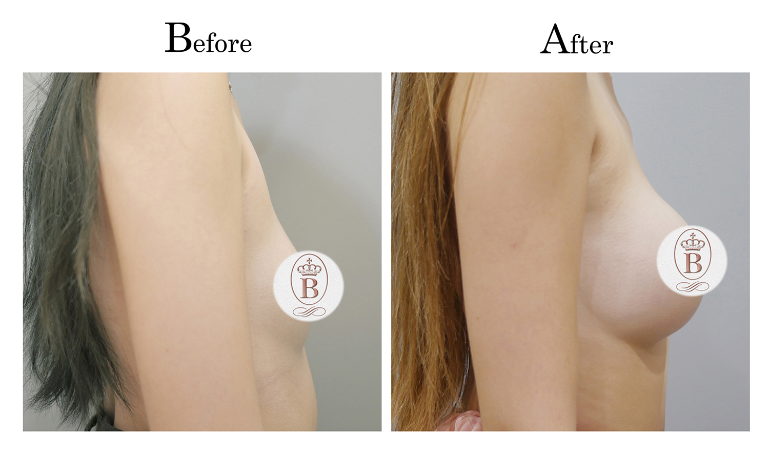 此案例本身條件屬於A罩杯,病患一直夢想希望到E罩杯,但又不希望感覺太OVER,另外也不想要術後一直按摩,因此選擇屬於比較自然術後也不需按摩的水滴型果凍矽膠隆乳,此次手術從腋下植入,因此從外觀看不到傷口,腋下的切口癒合後藏在皺褶中,也不容易看出。