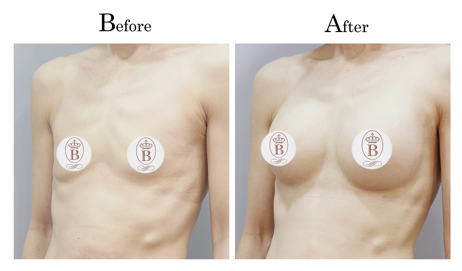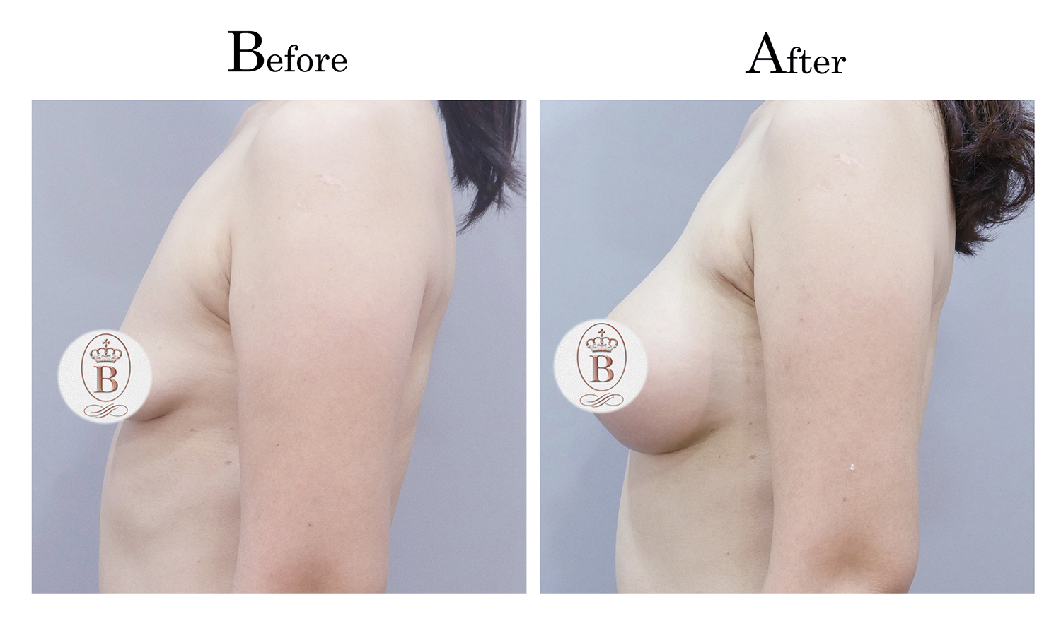 此案例本身條件屬於C罩杯,本身狀況不算差,只是因為產後上胸有些萎縮,可以選擇自體脂肪隆乳或異體植入物隆乳,此病患需求為一次升級較多罩杯,加上希望上胸飽滿一些,因此選擇圓盤型絨毛膜面果凍矽膠隆乳。