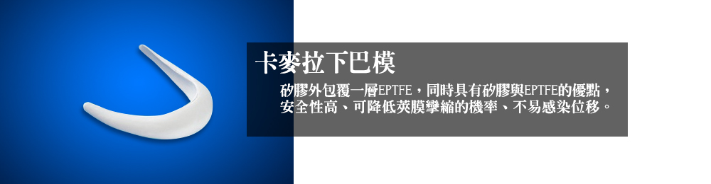 卡麥拉下巴軟骨外觀呈乳白色,是將矽膠外包覆一層EPTFE(又稱Goretex透氣貼片,多用於顏面重建、人工血管、心臟中膈缺損修補上)。也因為卡麥拉將矽膠與EPTFE兩種材質嵌合在一起,因此同時具有矽膠與EPTFE的優點,截長補短:其耐高溫可消毒,與人體接觸也不會產生化學反應,且EPTFE表層有許多孔隙,可讓組織附著生長,與人體組織密合,也不易動搖位移。