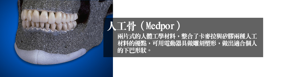 人工骨(Medpor)為兩片式的人體工學材料,為生物相容性多孔聚乙烯所製造,其材質能讓纖維血管生長,與身體組織整合,亦能用刀片與一定溫度改變形狀與作雕塑,可依據個人骨骼的不同做出理想的下巴形狀。將人工骨置入下巴後,用金屬釘固定以防位移。人工骨能將下巴角度往兩頷延伸,有效拉長正面臉型,很適合下巴短小與下頷嚴重後縮的受術者。