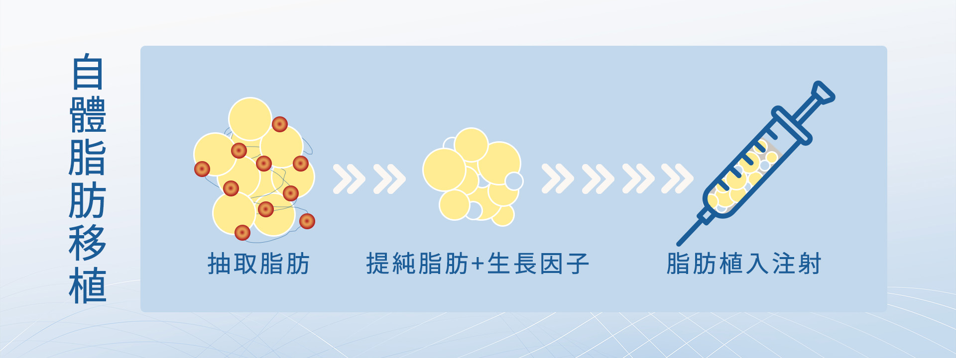 所謂的「自體脂肪移植」,便是抽取身上多餘的惱人脂肪(通常是腰腹臀等處),再經離心純化後注射至蘋果肌、法令紋、太陽穴等凹陷處,彌補缺憾,雕塑回春。自體脂肪又被譽為人體的軟黃金,它不僅是天然的填充材料,現今的移植填充技術更在其中添加了生長因子,具有不斷再生分化成表皮細胞、脂肪細胞、軟骨細胞與肌肉骨骼細胞的能力,更能使幾乎變得光亮豐潤,使人更加容光煥發。