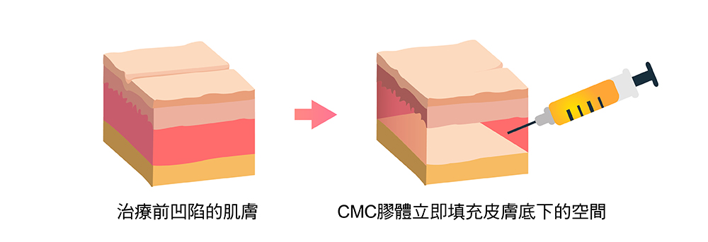 注射當下立即見效,立即獲得填充與拉提效果:不像舒顏萃雖可刺激膠原蛋白增生,但需要三至四個周才能看見效果,CMC膠體立即填充皮膚底下的空間,不須額外的時間等待。
