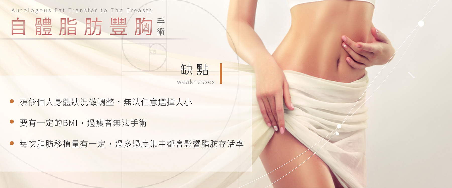 手術創口小,恢復期自然縮短很多。抽取自身脂肪,可同時雕塑身型,豐胸、瘦身一次滿足。
