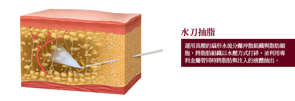 水刀抽脂改善了傳統抽脂的缺點,又稱為濕抽法。其作用原理,是運用高壓的扇形水流(氣壓可調整30bar110bar),分離沖散組織與脂肪細胞,將脂肪組織以水壓方式打碎,並利用專利金屬管同時將脂肪與注入的液體抽出。水刀抽脂注射的腫脹液不會滲透到脂肪細胞中讓它變大,因此術後腫脹程度會比傳統抽脂減少一半以上。