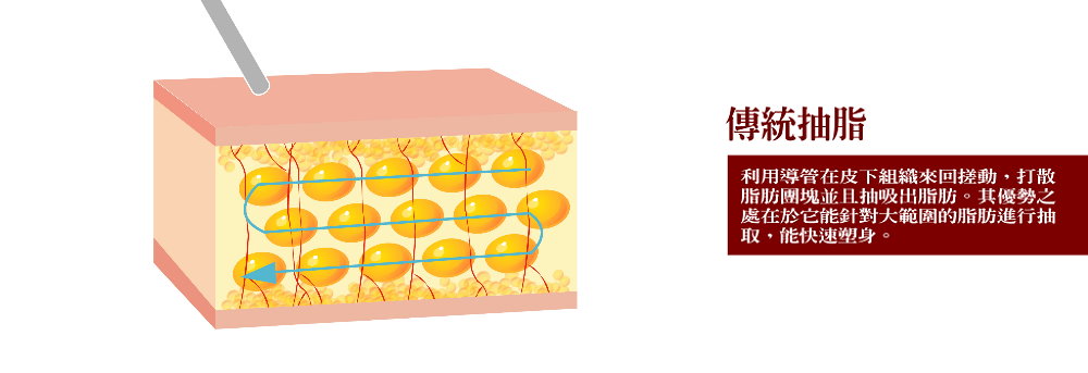 傳統抽脂的方法是利用導管在皮下組織來回搓動,打散脂肪團塊並且抽吸出脂肪。其優勢之處在於它能針對大範圍的脂肪進行抽取,能快速塑身;但也因為導管大,吸力強,若是執刀醫師經驗不足、手術過程中力量控制不當,容易導致血管、神經與結締組織的傷害,因此疼痛感嚴重、出血量多、術後恢復期長,甚至造成神經損傷,術後皮膚凹凸不平的現象。