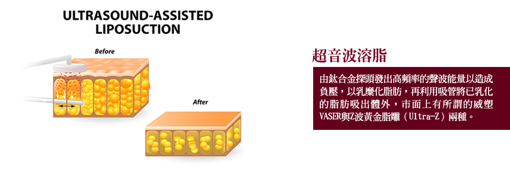 由鈦合金探頭發出高頻率的聲波能量以造成負壓,形成空穴作用(Cavitation)以乳糜化脂肪,再利用吸管將已乳化的脂肪吸出體外,市面上有所謂的威塑VASERZ波黃金脂雕(Ultra-Z)兩種,其實作用原理都是利用超音波進行溶脂,差異只在於設備廠商的不同而已。