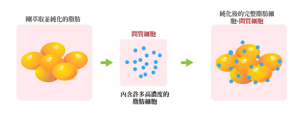 其作法是在純化脂肪中加入脂肪間質細胞或生長因子,混合均勻後再注射至需填補之處,經證實此一技術能使自體脂肪移植的存活率能夠從原本成效不彰的三四成提升至七八成,大大降低脂肪組織壞死、鈣化的危機。