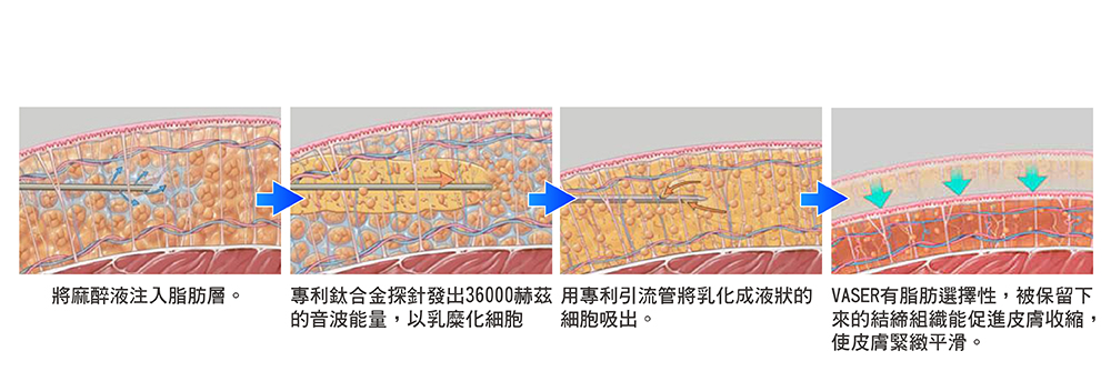 VASER威塑作用原理:利用音波乳糜化脂肪,不傷組織血管
