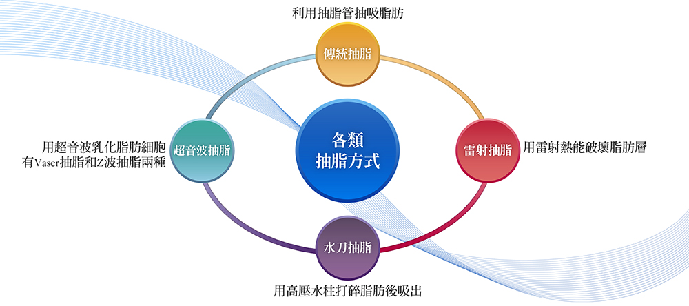 水刀抽脂手術:運用高壓水流軟化、打碎脂肪,並以金屬管同時將脂肪與注入液體抽出。水刀抽脂注射的腫脹液不會滲透到脂肪細胞中讓它變大,因此術後腫脹程度會比傳統抽脂減少一半以上。