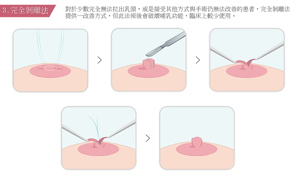 假如乳頭凹陷過於嚴重,或是其他手術過後仍舊復發,可通過完全剝離法做改善,只是此法會使術後完全無法哺乳,乳頭形狀也較不立體,因此臨床較少使用。