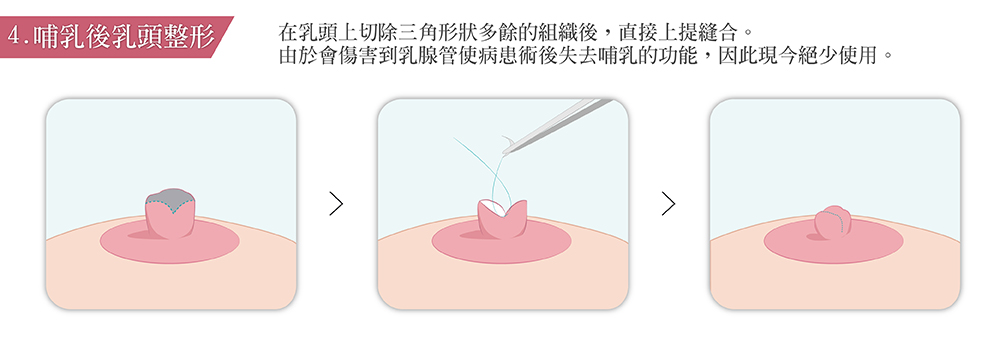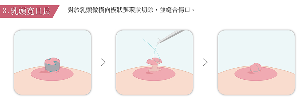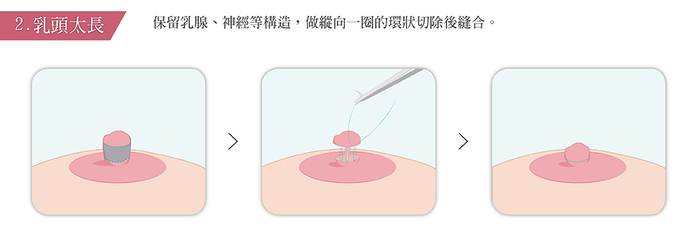 乳頭太長者,手術會做縱向一圈環狀的切除後縮短乳頭高度做縫合,而非傳統直接橫切造成乳腺受損。