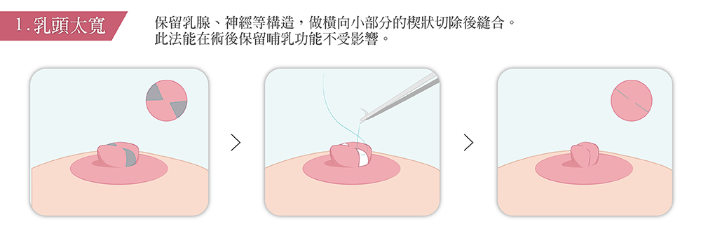 乳頭太寬者,手術會做橫向做小部分的楔狀切除後縫合,不同於過去傳統直接對乳頭採L形大量削減組織與皮膚,破壞乳腺管造成術後哺乳的困難,此法可以在術後保留哺乳功能不受影響。