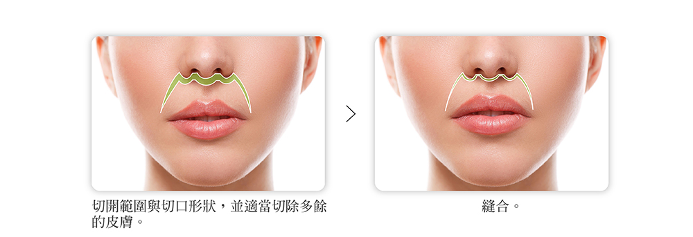 人中縮短手術也可稱為翹唇手術或是提唇手術,術後除了能夠確實縮短人中以外,也能夠一併提升上唇的角度,塑造出唇形微翹且年輕化之效。其手術方法是在麻醉過後,在鼻翼邊緣與鼻中柱底部的接線處做一道連貫性的手術切口,將皮膚作適當的切除後上提至鼻翼與鼻中柱根部做緊密的縫合,盡可能地將疤痕隱藏於鼻子底部。手術後受術者要注意疤痕的護理,另外由於人中縮短手術可能會改變鼻中柱角度與鼻翼形狀,因此必須考量個人鼻形是否適合該手術,假如鼻形較短或是鼻孔外露的病患,會建議先行施作鼻部整型手術予以矯正後再來接受人中縮短手術的改善。