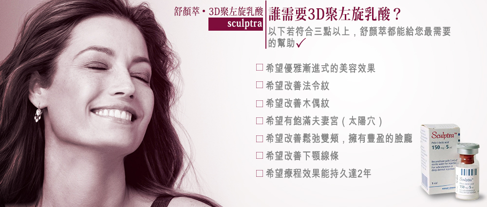 而sculptra舒顏萃主要成分為3D聚左旋乳酸(Poly-L-lactic acid/PLLA),其與無菌蒸餾水調和成的溶液注入真皮層後,其成分會暫時取代肌膚流失的膠原蛋白的空洞,並在肌膚組織中進行崩解釋放,同時促進膠原蛋白的增生,促進肌膚自身的賦活原力,效果可長達兩年。