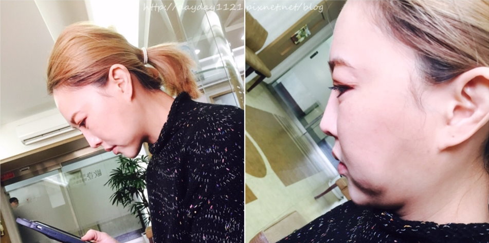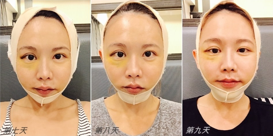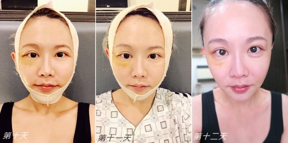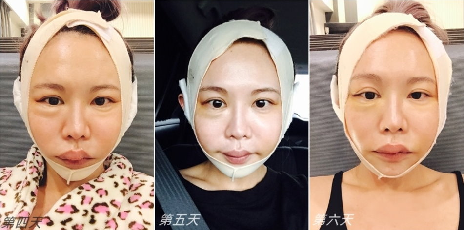 第一天到第三天臉有點脹痛感有吃藥,第三天開始腫,不能見人所以都在家裡休息,自己照鏡子看起來覺得臉部是協調的,沒有出現大小眼或臉歪嘴斜拉太緊的狀況,手術感覺上應該是成功的….