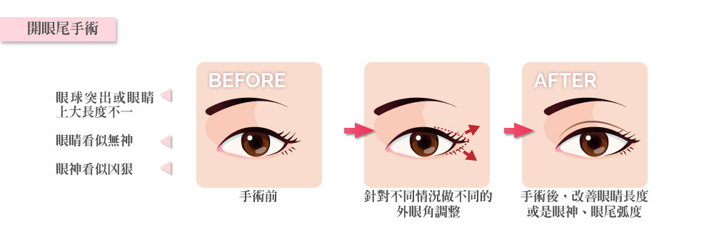 除了眼頭手術,開眼尾手術也能使眼型增大,通常開眼尾手術多用於眼睛外觀與功能的重建。適用於眼睛太小、眼型太短、眼距太近不適合做開眼頭手術的受術者,手術方式是割去眼尾部分菱形皮瓣,將眼尾打開並將其上提固定,使眼睛更細長圓亮、外眼角弧度更加柔和,眼神自然更為柔媚深邃。