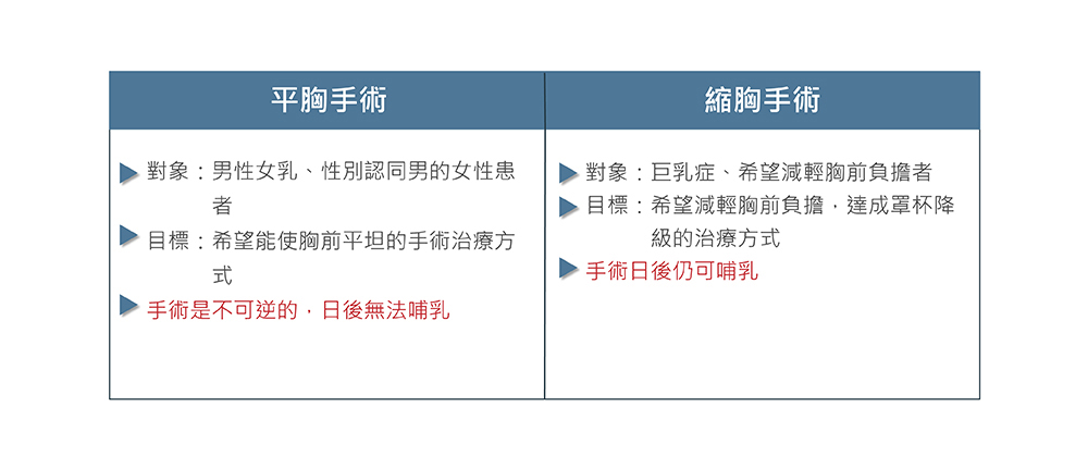 基本上都是針對乳房體積做縮減的手術,但兩者不盡相同:首先,「平胸手術」主要針對是患者男性女乳、性別認同是男的女性患者,希望能使胸前平坦的手術治療方式;而「縮胸手術」是針對希望減輕胸前負擔,達成罩杯降級的治療方式,如巨乳症的患者。