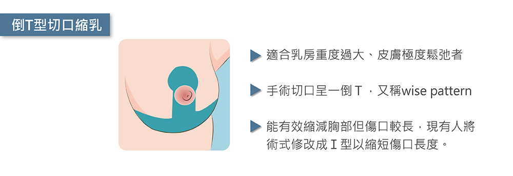 倒T切口縮乳又被稱為wise pattern,適合皮膚極度鬆弛,尤其是大量減重後乳房下垂者,也就是說它適用於於需要大量切除皮膚與乳房組織的受術者,倒T切口縮乳手術因能取大量多餘組織,因此平胸縮胸的效果極好,缺點是手術切口呈現一個倒T型,傷口較長。但最近有些醫師將之改良,將手術切口縮短如一I字來完成手術,使傷口長度大大縮短,也使人較不因傷口過長而卻步。
