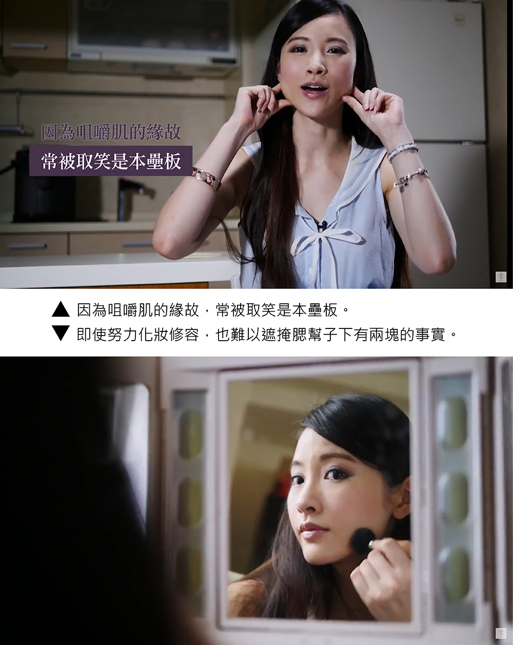 其實芷晴自己也知道臉變大的原因是什麼,那是過度發達的咀嚼肌。可能是自己愛吃較有嚼勁的食物如口香糖、魷魚絲等,導致自己腮幫子下的兩塊舉嚼肌過度發達,只要一用力,腮幫子邊就鼓起兩塊,造成臉型不佳,面部線條不夠柔美。