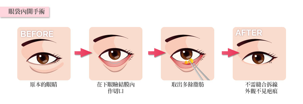 其二是眼袋深沉的問題,可以利用內開眼袋手術來予以解決。基本上眼袋手術分為內開式與外開式兩種,內開式眼袋手術適用於肌膚仍有良好彈性,不需移除多餘皮膚的年輕族群。內開眼袋手術作法是從結膜下緣開約2至5釐米的小切口,將突出的脂肪適量移除或是推回原位後再縫緊筋膜。具有術後腫脹輕、復原期短、不會留下手術疤痕等優點。