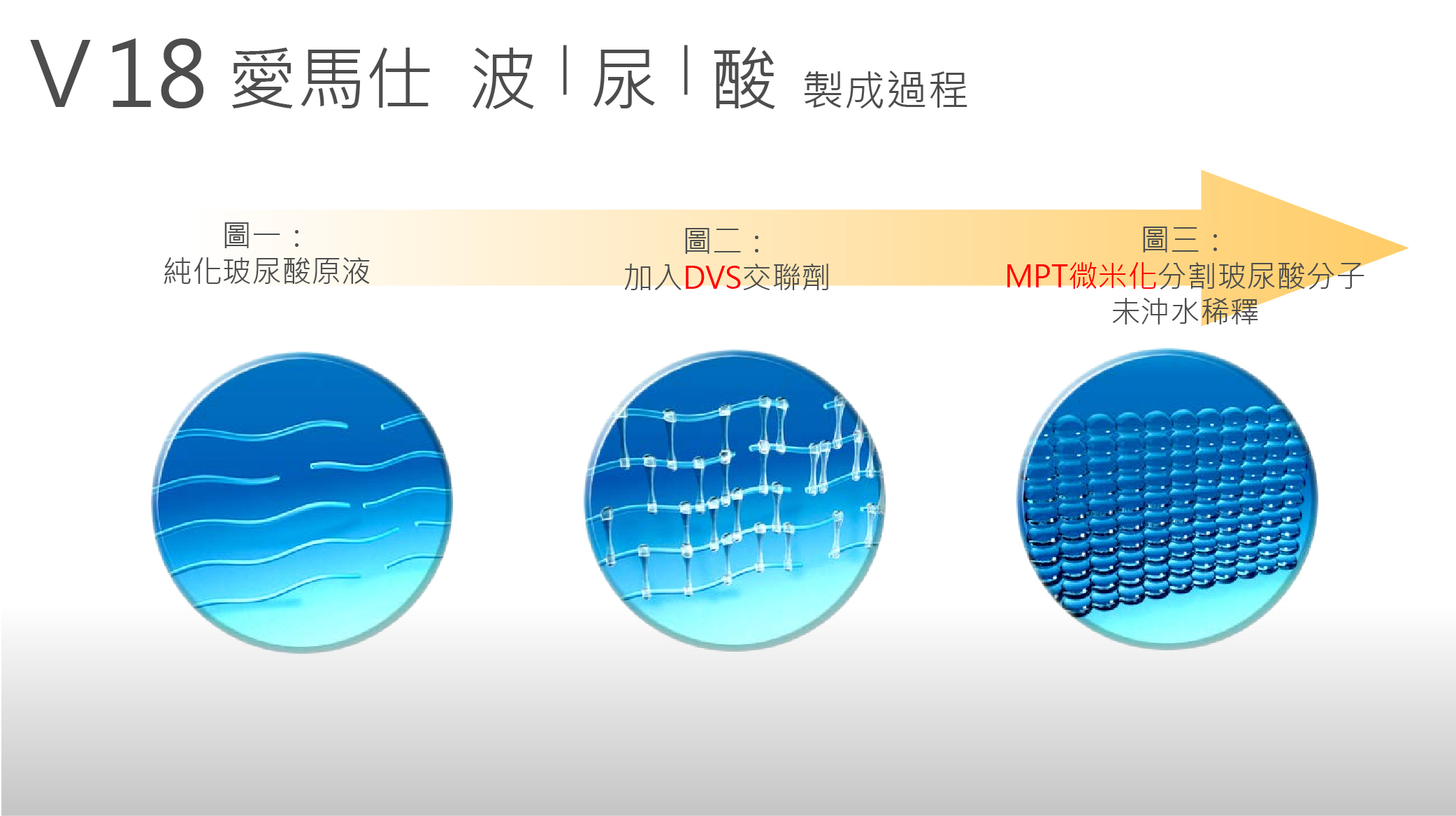 市場最高濃度之玻尿酸:在最終製成過程中並未沖水稀釋,最終製成的無游離水分之高濃度玻尿酸,效果可維持長達18個月,維持時間最久。但要注意的是:V18玻尿酸的效果期限會隨著病人年齡、生活習慣、治療區域、注射方式有所不同,可能影響治療效果。