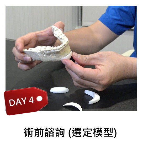拿到製作完成的下顎骨3D列印模型後,廠商會與醫師溝通製作出3D下巴模型樣品3-5種(此模型非直接植入隻模型,只是樣品供病患核對與醫師溝通),待3D下巴模型樣品製作完成【需一天時間】,便可約病患回診與醫師討論最後確認要植入的下巴模型使哪一種,選定後即可安排手術時間。