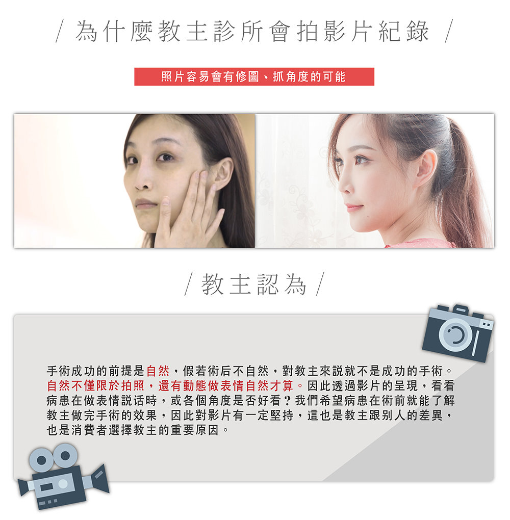 教主整形外科診所的醫療團隊,累積眾多隆乳手術經驗,在案例的呈現上,擁有許多從術前術後拍攝的影片紀錄,將手術的結果用最真實的方式呈現給消費者,很感謝願意提供拍攝的消費者,因為有他們,讓更多想嘗試手術的消費者得以了解手術前後的差異及心得分享,這樣的呈現,是僅提供手術前後BA照片的診所無法比擬的,畢竟,照片存在著太多不確定因素,因此教主堅持,希望消費者能夠感受的到我們的用心。