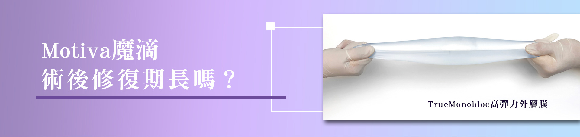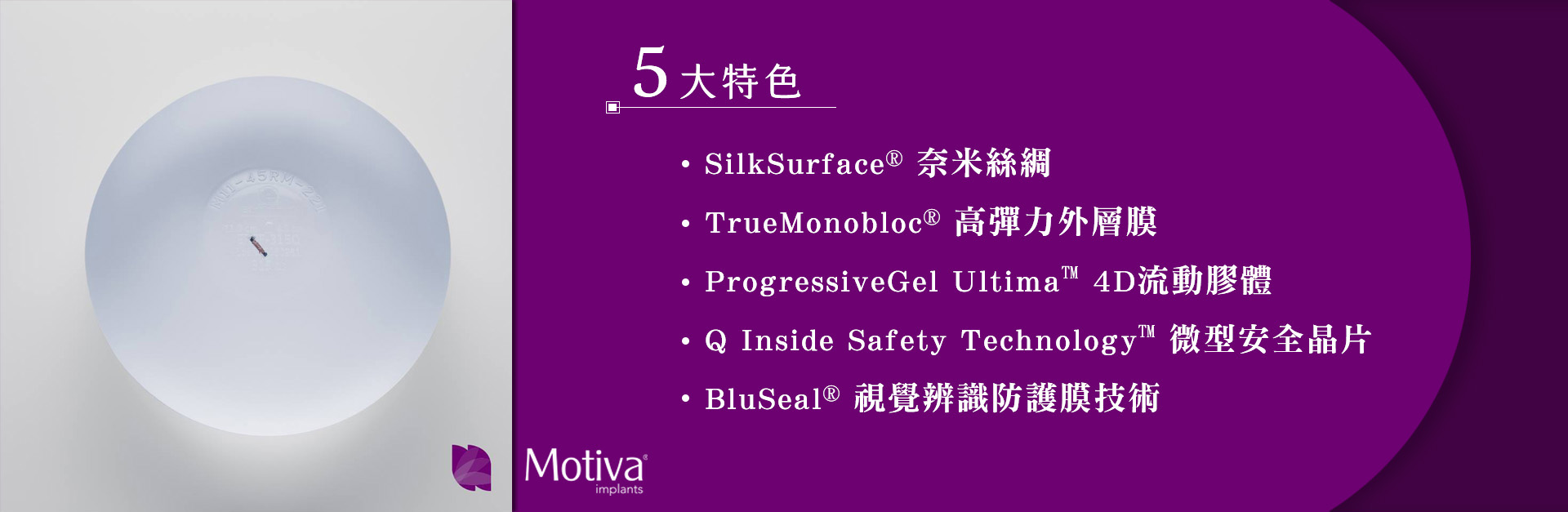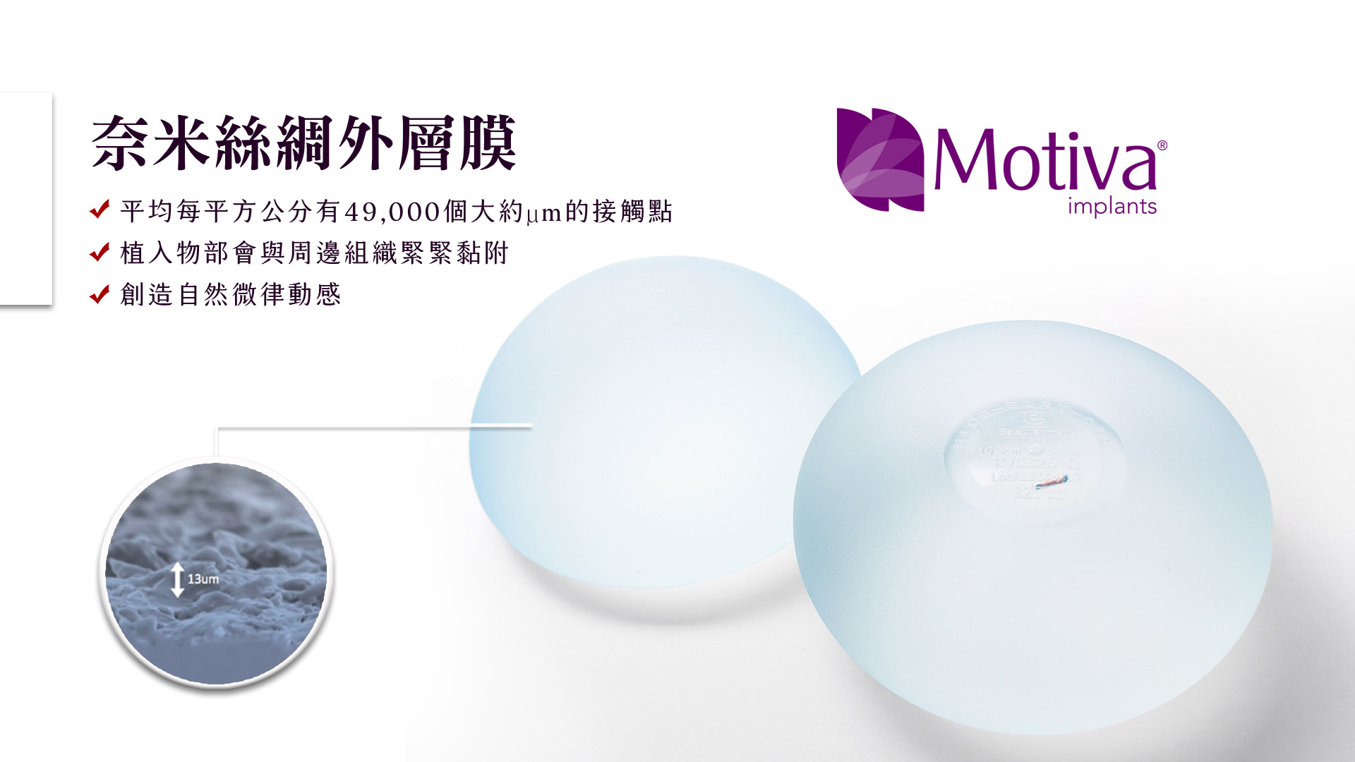 Motiva外層膜能夠呈現一致的高彈性,柔軟且強韌,具有高度延展性與彈性,破裂率較低,能用極小切口植入義乳,手術疤痕小、修復與過去相比較時間縮短、疼痛度也降低許多。