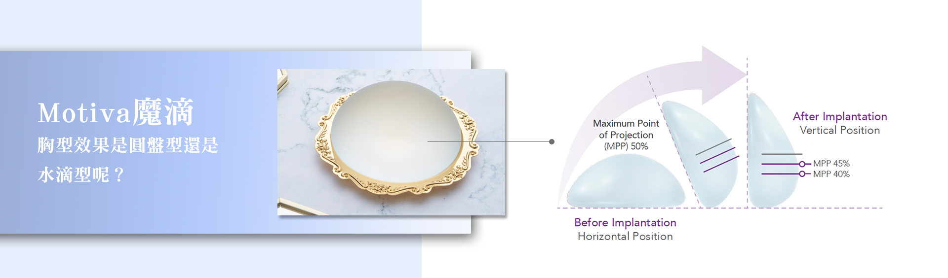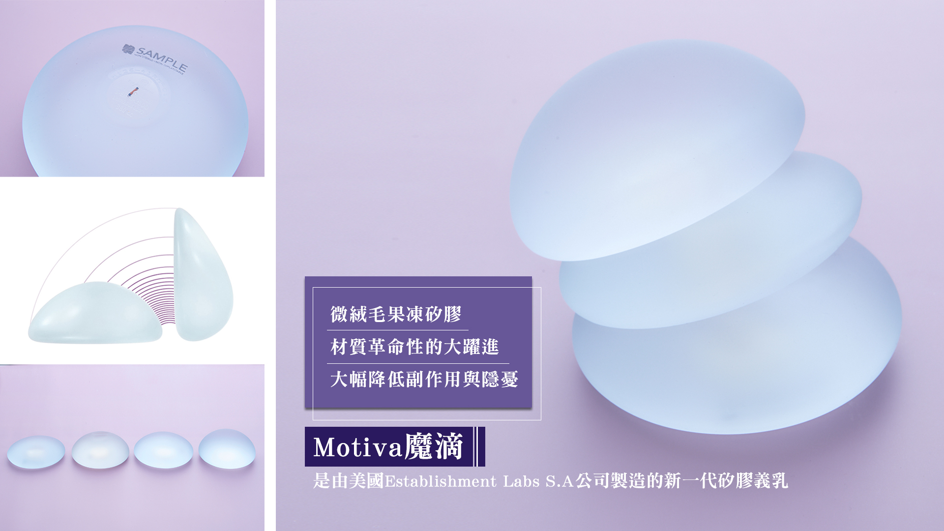 最早聽到的從鹽水袋隆乳、圓盤型到水滴型果凍矽膠隆乳,隨著醫學科技的演進,果凍矽膠隆乳手術的材質與技術不斷在提升,新一代自然美胸技術所推出Motiva魔滴隆乳,與過去以往最大的不同點在於它的流動膠體技術、安全晶片、奈米絲綢外層膜,讓果凍矽膠隆乳手術整體安全性大為提升,進而降低併發症。