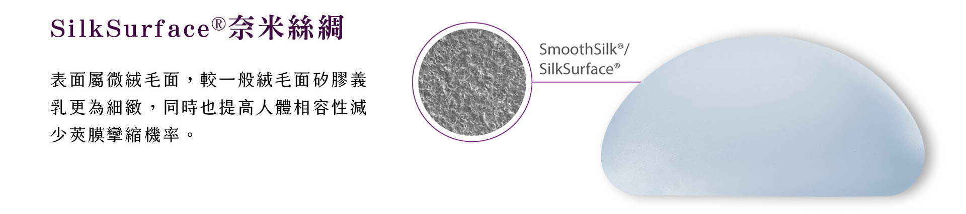 表面屬微絨毛面,較一般絨毛面矽膠義乳更為細緻,同時也提高人體相容性減少莢膜攣縮機率。