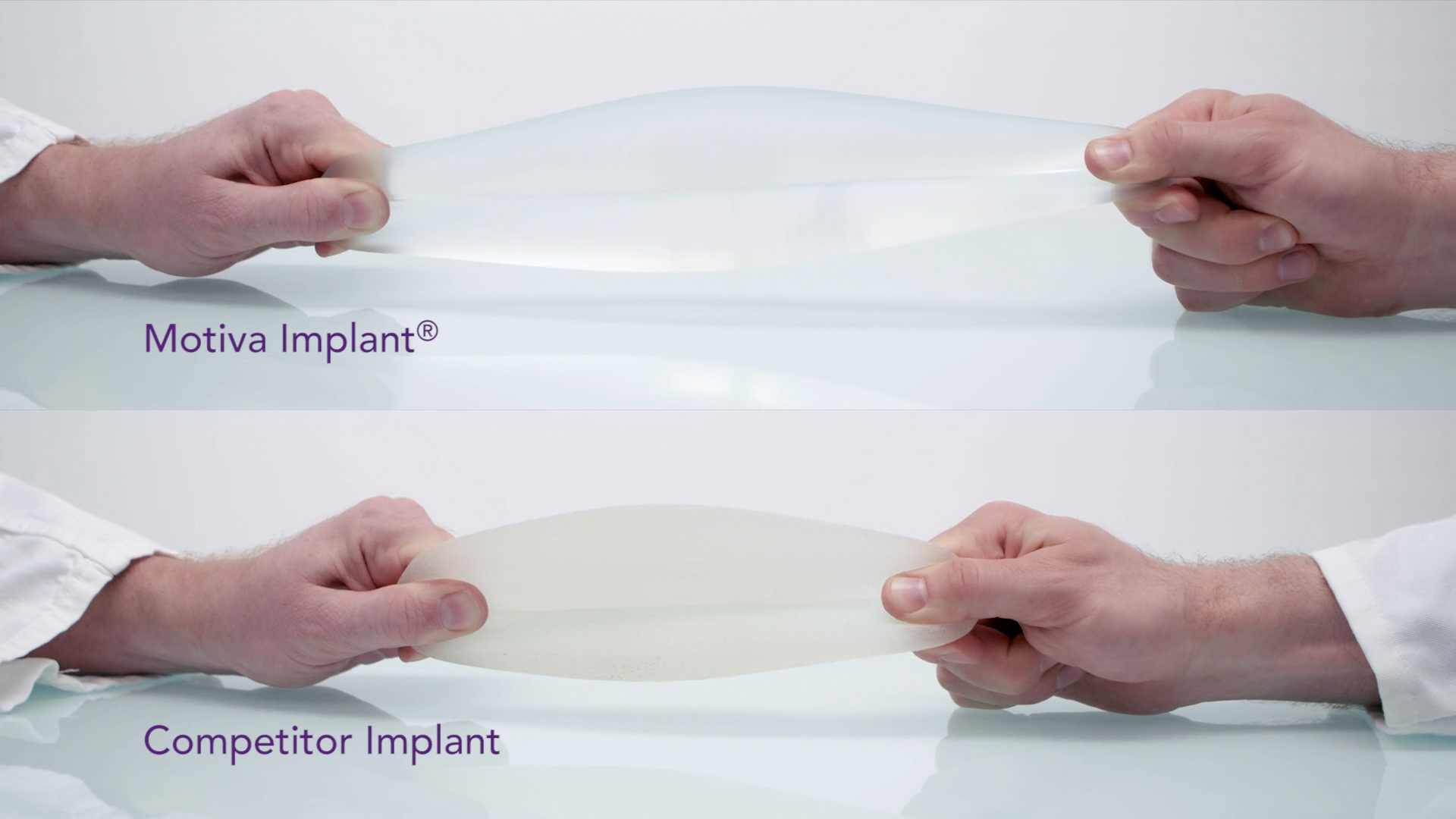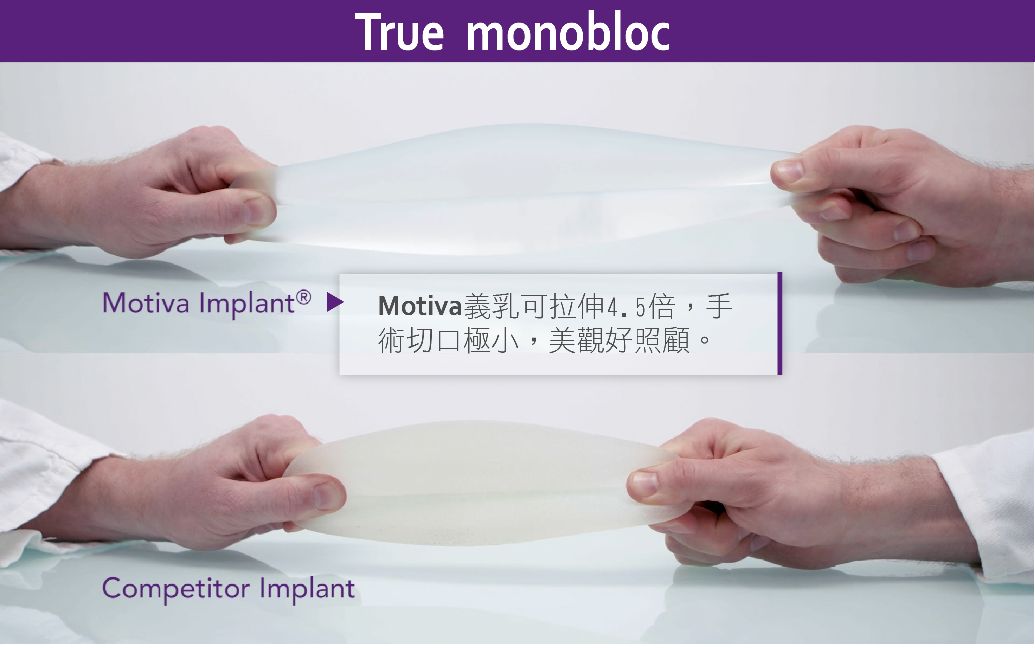 其外殼有專利True monobloc,使魔滴Motiva延展性高達450%,可以延展拉長4.5倍回彈不變形、斷裂,這代表Motiva魔滴不怕醫師從認為切口置入義乳,傷口可以更小,塞進去也不變形,義乳破裂機率只有0.1%。