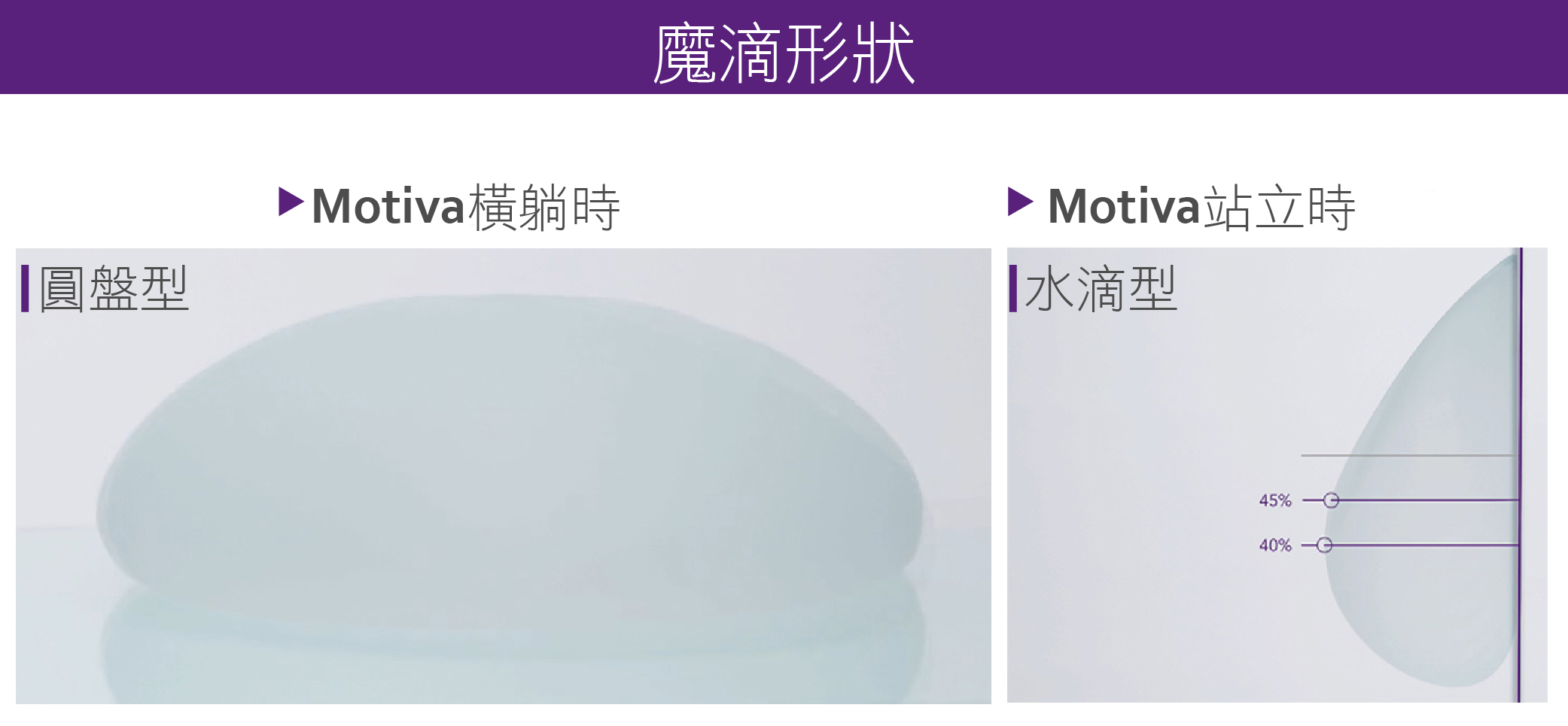 Motiva魔滴不是圓形,也非水滴型,而是能隨動作改變形狀、超越傳統假體的革命性產物,其Ergonomix工學設計讓Motiva能隨著人體律動、胸部重力而改變形狀:躺著是展開的圓盤狀、站立時則是自然的水滴型,讓假體無論在外觀、感覺、觸感或在活動時,也可說是與自然胸部無異。