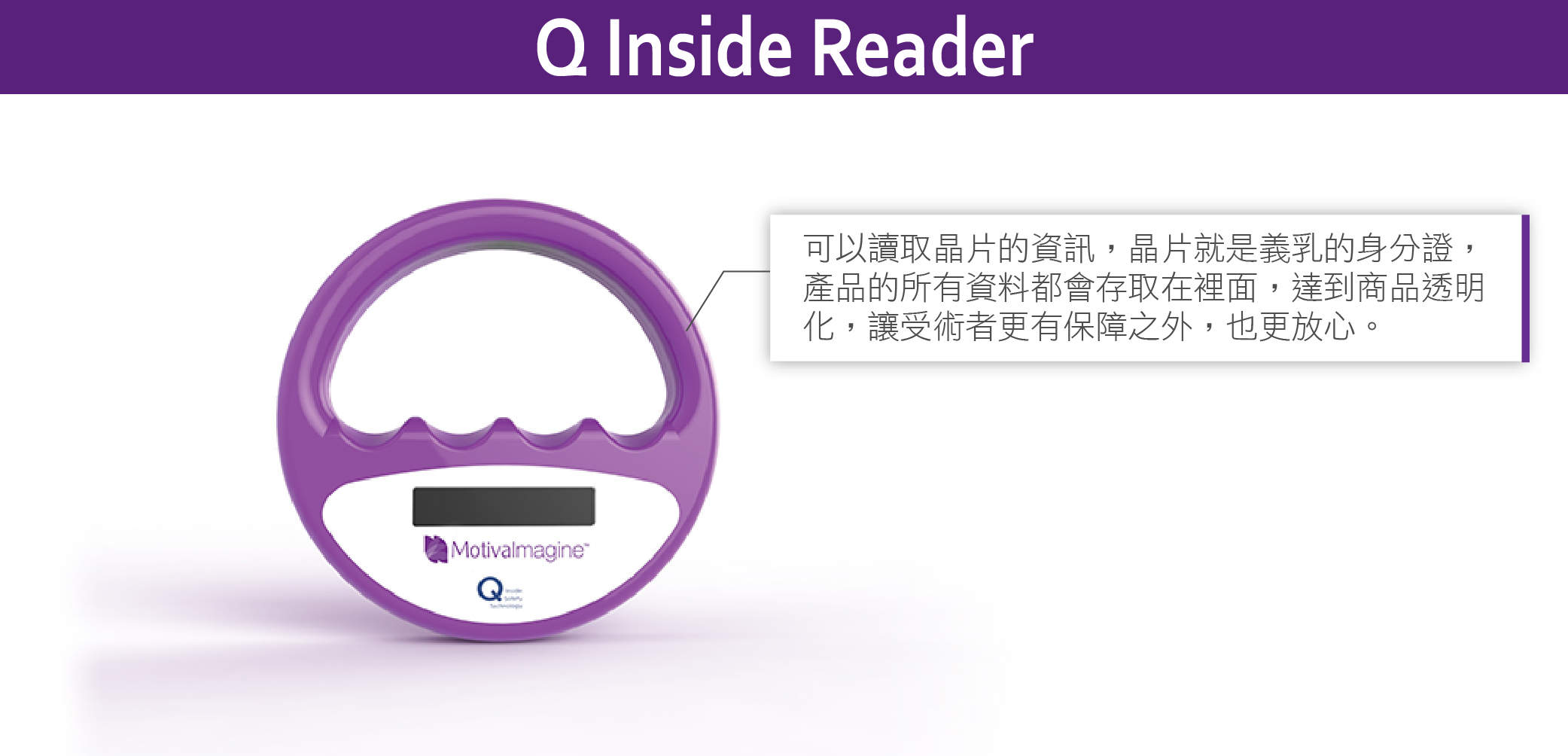 除了其本生特性的優勢,Motiva魔滴將義乳尺寸、型號、出廠年份等資料整理在一個非常小的晶片當中,稱為「Q Inside Safety Techology」,除了有防偽功能外,晶片不僅對義乳的使用壽命與受術檢查不造成任何影響外,也方便醫師在術後檢測假體在人體內的情況。