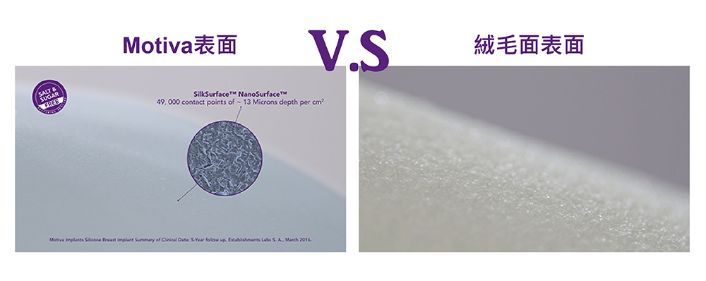 原本果凍絨毛矽膠的絨毛外殼就是為了降低莢膜攣縮而生,而Motiva的微絨毛Nanotexture表面其顆粒又較一般絨毛面來的更加細緻,也就是說:Motiva魔滴能讓莢膜攣縮的機率又更為縮小,甚至低於1%以下。與一般糖鹽形成的粗糙表面有所不同,Motiva魔滴表面幾乎不含任何加工物質,更能降低過敏發炎等併發症的機率與風險,提高人體對於義乳的適應性,使之更能自然地成為身體的一部份。