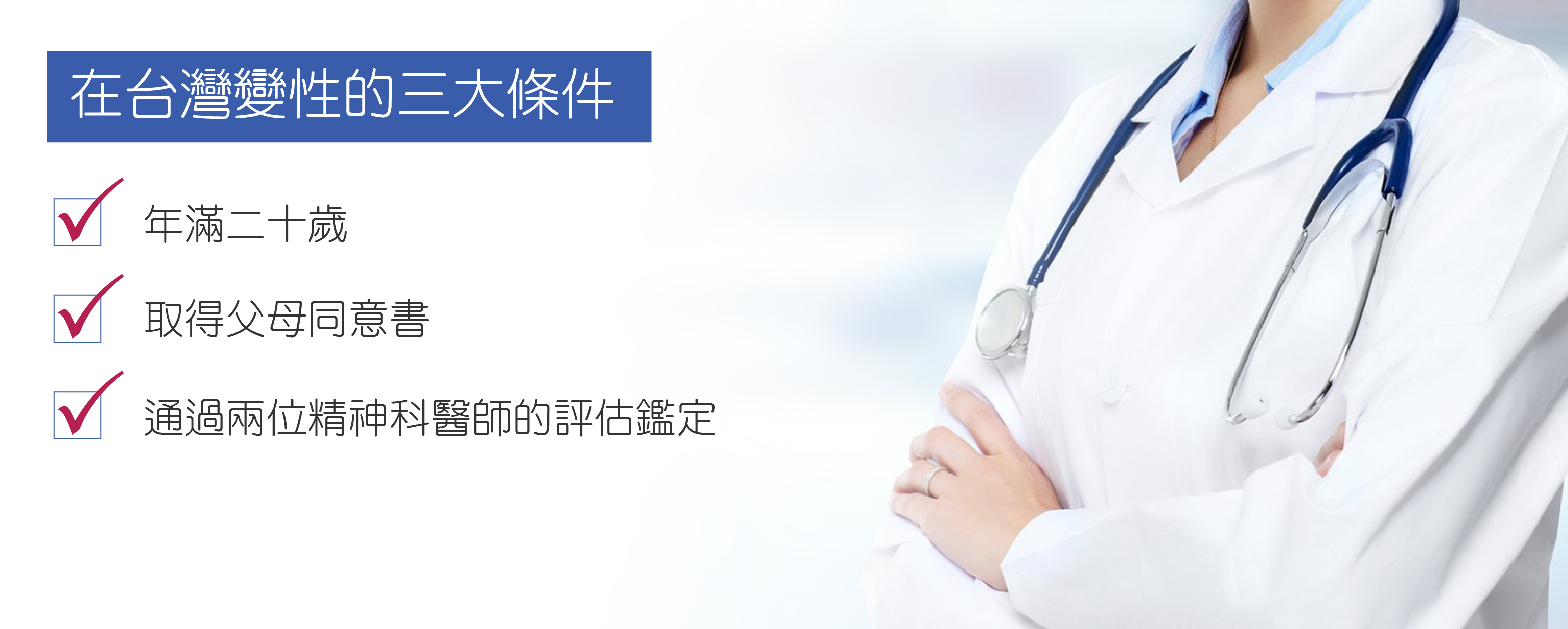 要接受變性手術有三大條件,年滿二十歲、取得父母同意書,與通過兩位精神科醫師的評估鑑定。