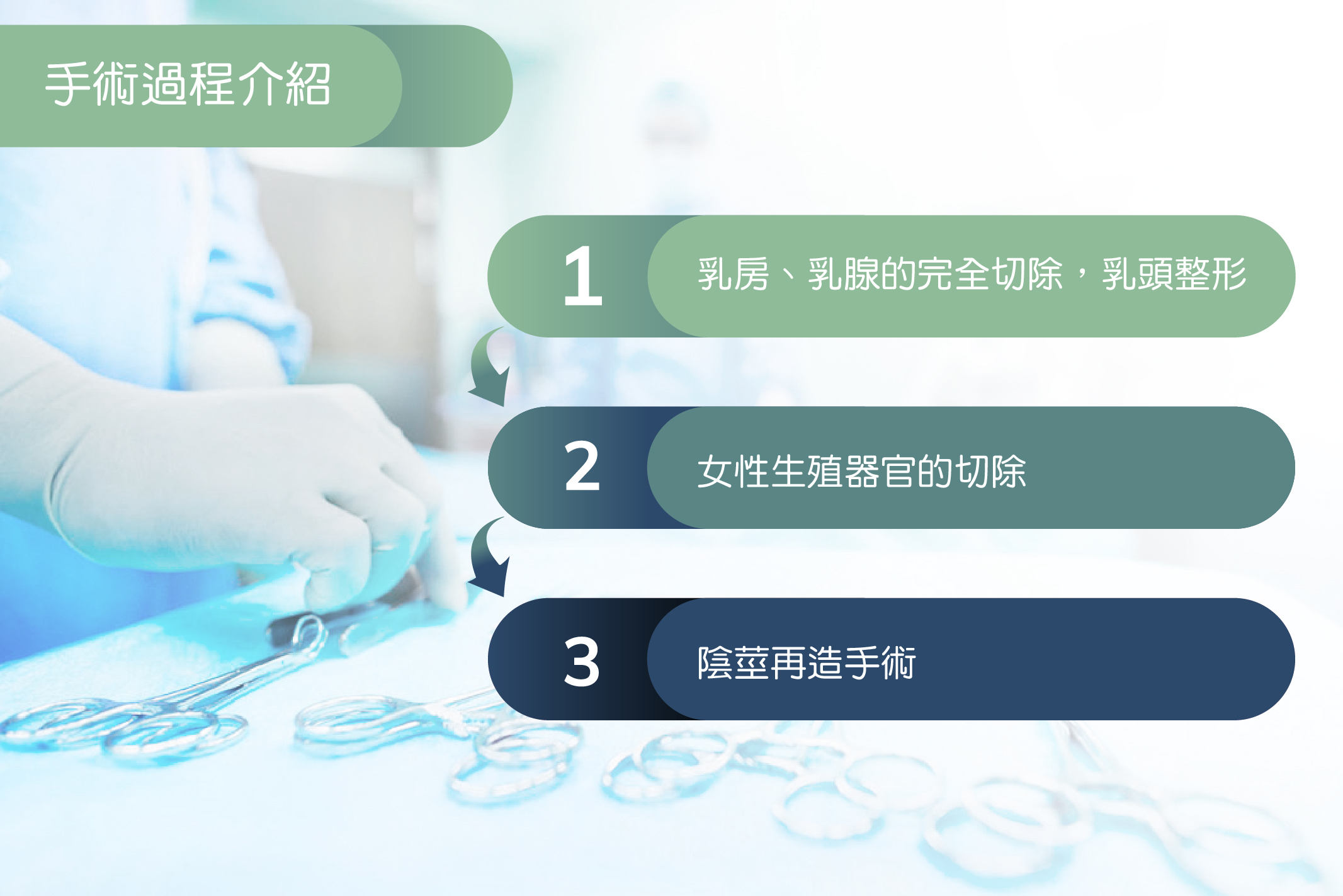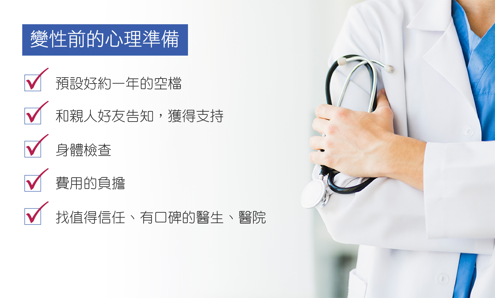 1. 要預設好至少約一年時間的空檔,因手術執行是一階段一階段慢慢地去改變,對於女生變男生的手術來說要先將胸部完整切除,再來就是子宮及卵巢的切除,之後則是再造陰莖,主要的生殖器官及第二象徵器官改變後,賀爾蒙就會慢慢地改變,可能會長出腿毛、聲音變粗之類的特徵,有些人之後會再針對於腹部、髖部等附加整形術,讓自己看起來更有雄性的特徵。