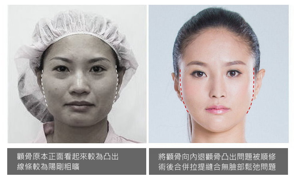 由於東方人眼眶平,不似西方人的眼眶骨立體,配上較寬或較高的顴骨反而突兀,有點感覺不易親近或較年長的感覺。尤其女性顴骨過高容易顯現陽剛感,或者部份患者有臉型較寬、大餅臉的困擾。