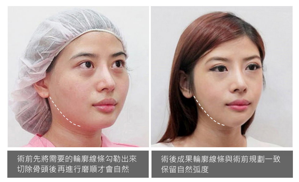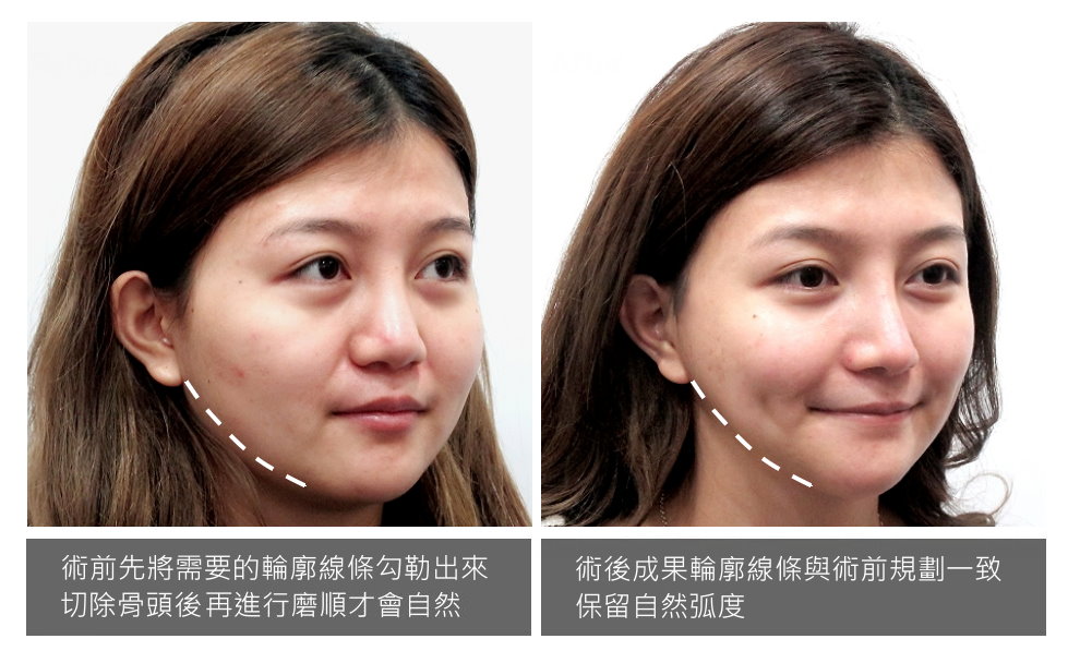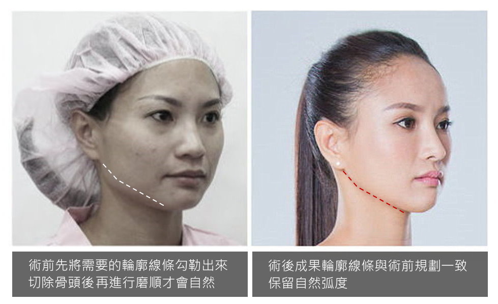 下顎骨切除與下巴V-Line截骨手術主要是為了改善臉部正面下臉過寬和側面下臉過方的問題,下顎骨切除後要與下巴長度、整體輪廓線一同審視,進行順修。而在做下顎骨角切除手術時,要注意不是並一刀隨便切下去,而是要先勾勒出輪廓,直線進行切除後,再將想要的弧線利用磨骨的方式將曲線細磨出來,假若是沒經驗的執刀醫師或不精緻的削骨手術,只是將骨頭切下,手術時間或許比較短,但是側臉輪廓看起來會很假不自然,大部分的消費者希望下臉輪廓自然,最好是讓別人察覺不到有動過手腳、斧鑿的痕跡,因此在手術上較為費工。