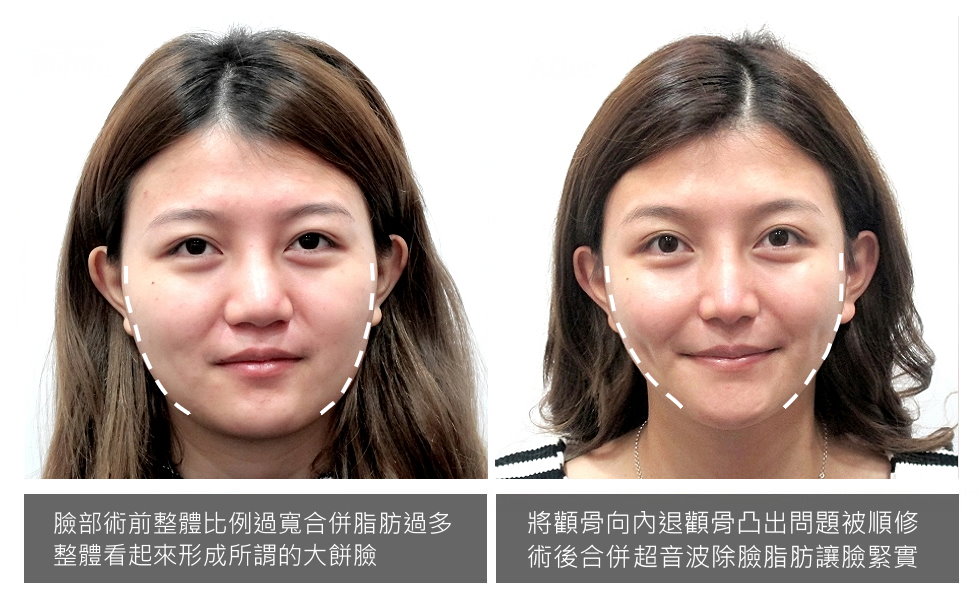 有些臉部脂肪較多的消費者,假如單做削骨手術,做完之後容易產生方臉變圓臉的狀況,也較容易產生臉頰鬆弛、向下垂降的問題。這樣的情況可透過兩種方式處理:輕微者可以合併取咀嚼肌或是口內取脂;脂肪囤積比較多的消費者,便需要合併做超音波溶脂來改善臉部脂肪過多的問題,超音波因為施作時會產生熱能讓軟組織遇熱收縮,以達到臉部緊實的效果,因此,針對肉餅臉施作削骨手術的消費者,合併超音波溶脂一同施作的效果是相當不錯的。