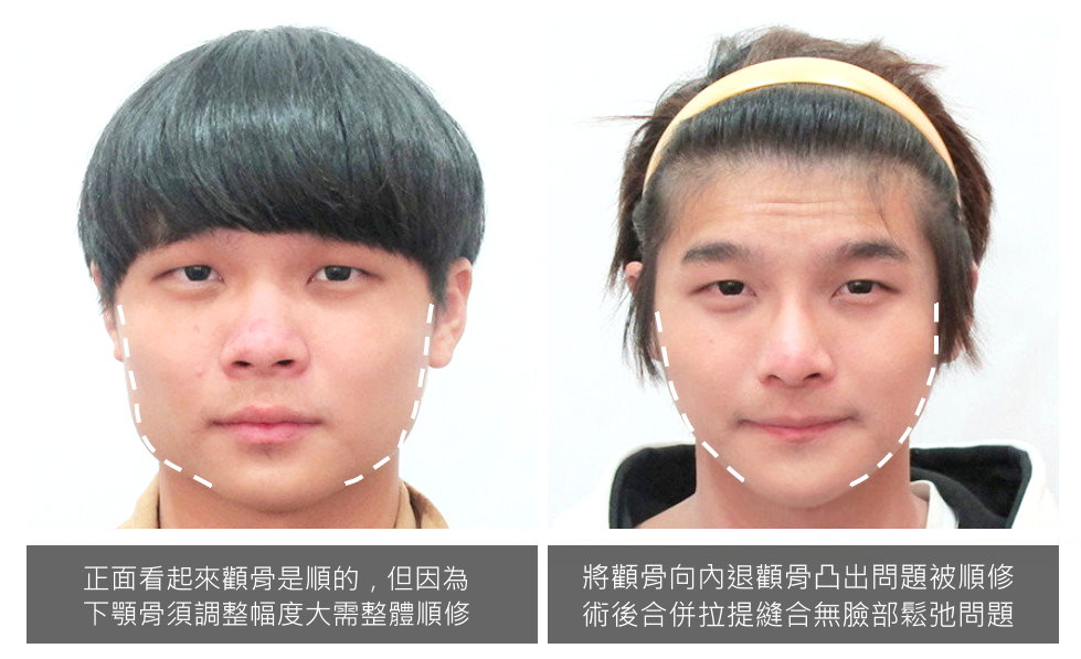 中臉的部分若要調整正面看起來顴骨凸出的問題,顴骨的調整需視下顎骨調整的多寡來做整體比例的協調配置,此案例正面看起來顴骨處有些微凸出,但不至於太過嚴重,因此以臉型的輪廓不凸起、線條柔順的基礎下進行微調即可。要注意的是,削顴骨如果削的角度不對或削太多,容易造成臉部軟組織向下鬆垂,因此須經執刀醫師謹慎評估,並在手術縫合時利用特殊方式進行拉提,以減緩軟組織下垂的問題。