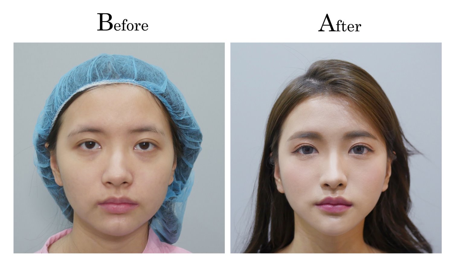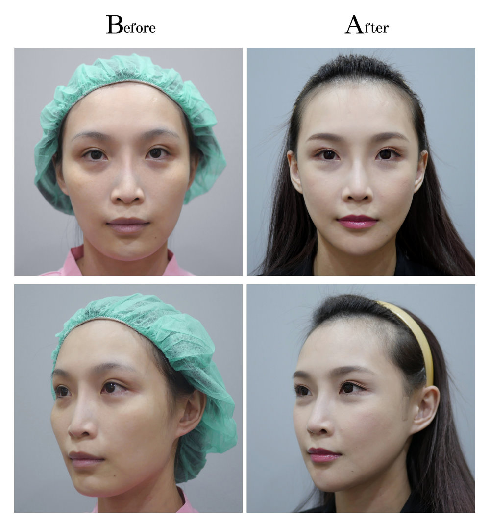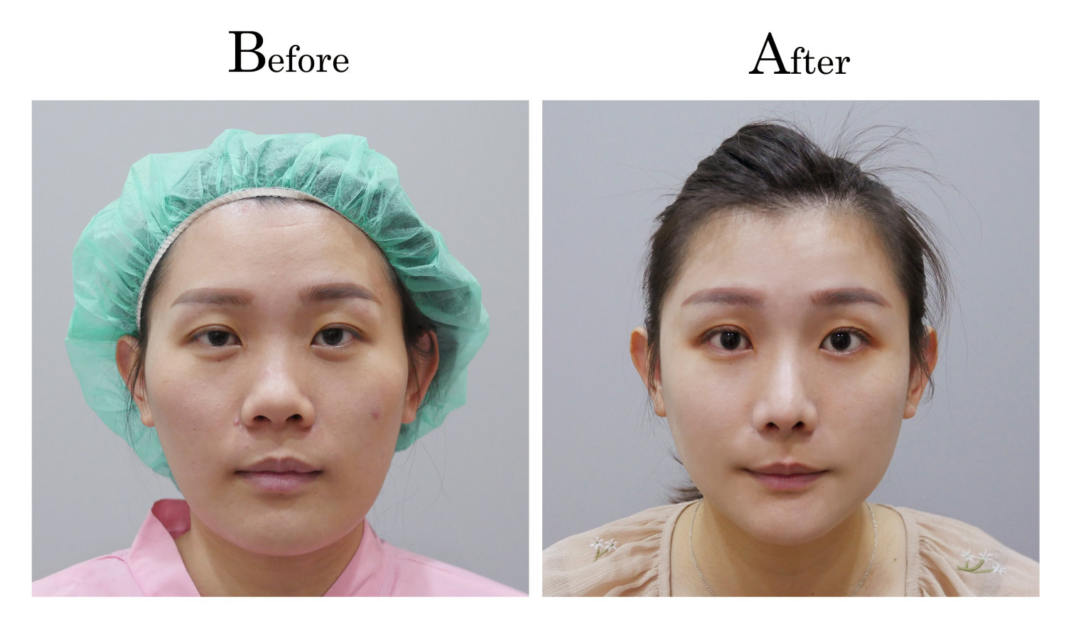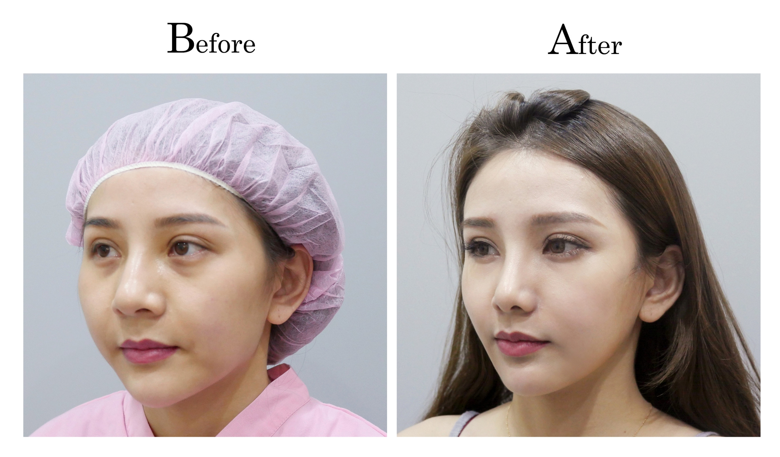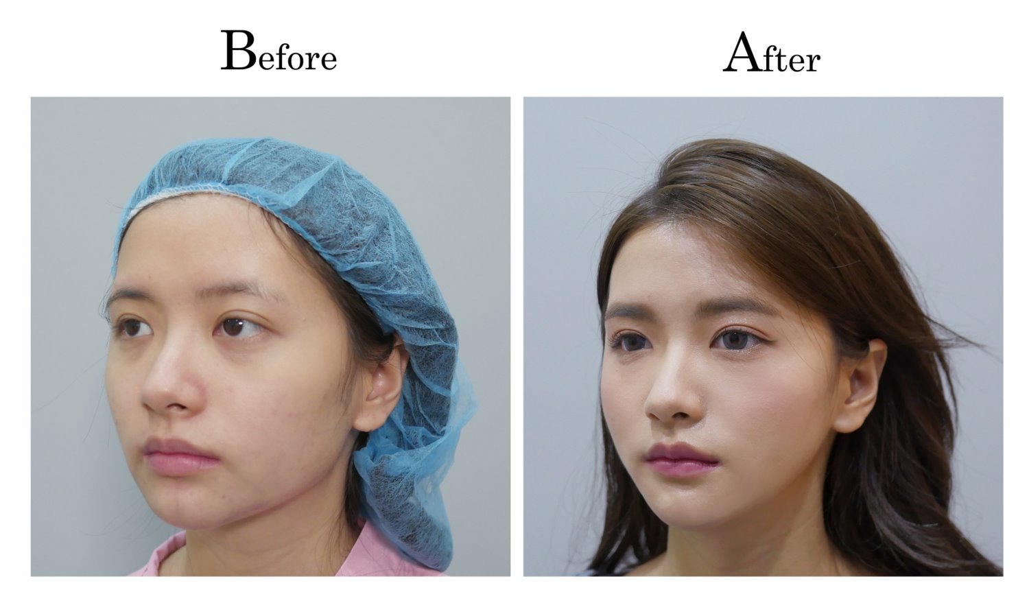 此案例術前臉型較為粗曠陽剛,從正面來看,首先需要將臉部輪廓順修,手術方式為進行顴骨和下顎骨角手術,再來須將臉部比例加長,手術方式為GoreTex墊下巴手術,術後感覺臉部輪廓變得更為柔順,整體五官也變得更為立體精緻。