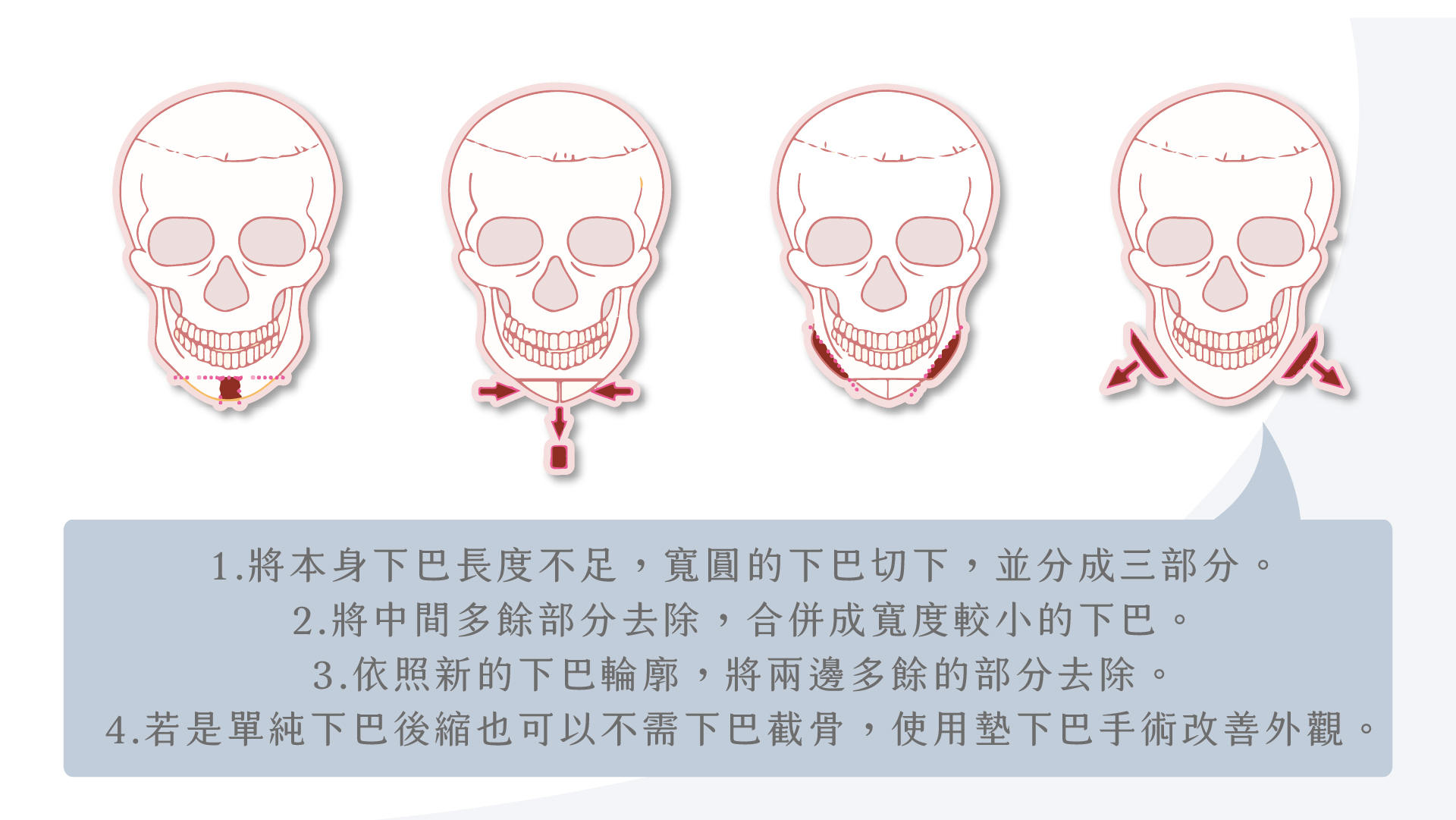 下巴截骨手術則是將下臉輪廓切除的骨頭拼出下巴的形狀後進行固定,因為是「取之於己,用之於己」的材料,因此手術後續較不容易產生發炎、排斥等問題,要注意的是臉部正面向下拉長的比例要協調,側臉往前挺翹的程度要從鼻尖嘴唇和下巴頂端三點連成一線才會好看。