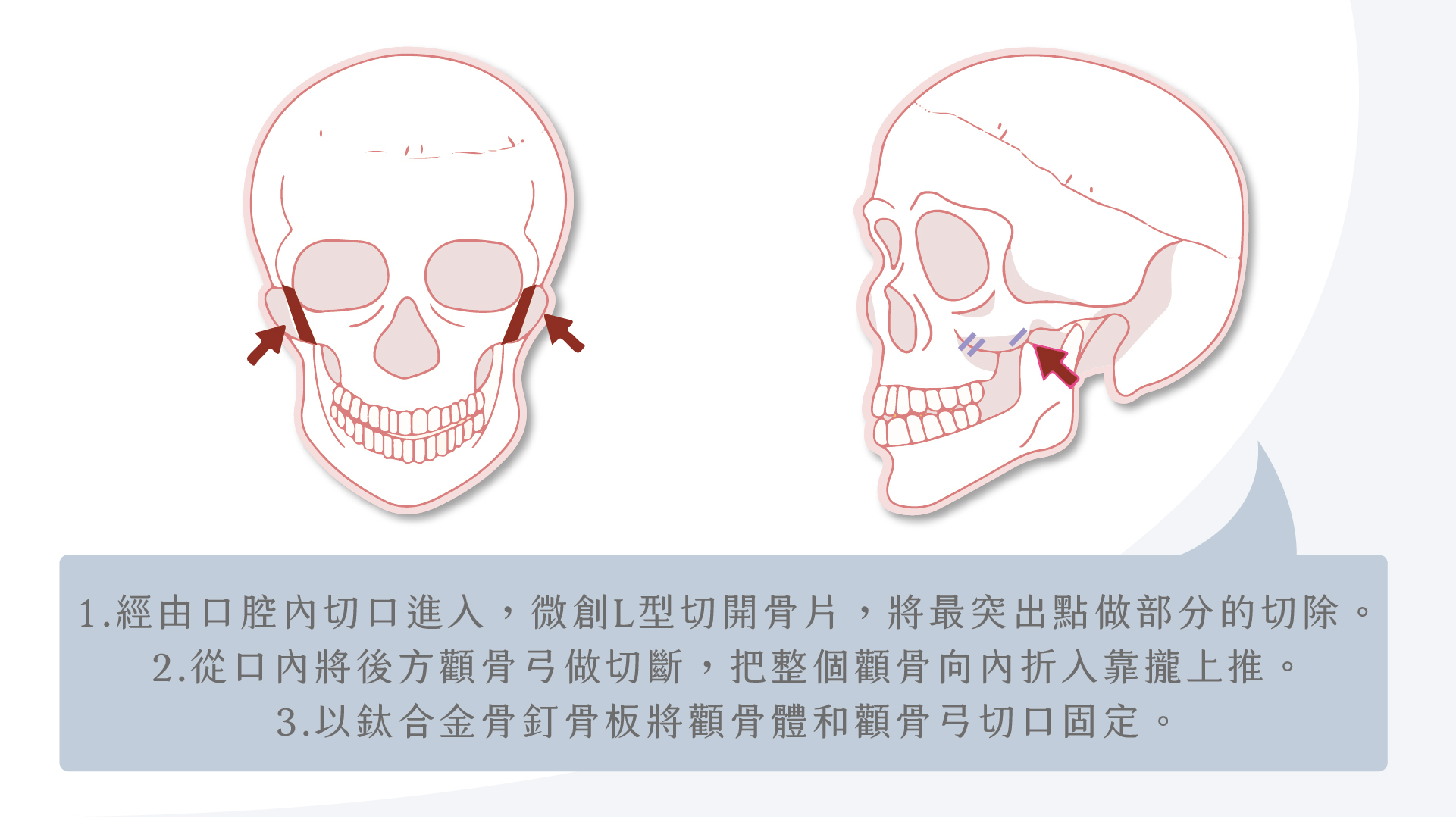 2.從口內將後方顴骨弓做切斷,把整個顴骨向內折入靠攏上推。3.以鈦合金骨釘骨板將顴骨體和顴骨弓切口固定。