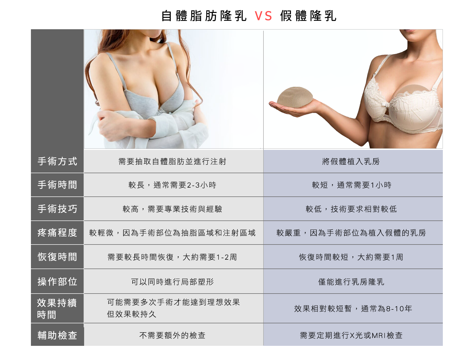 | 對比項目 | 自體脂肪隆乳 | 假體隆乳 |