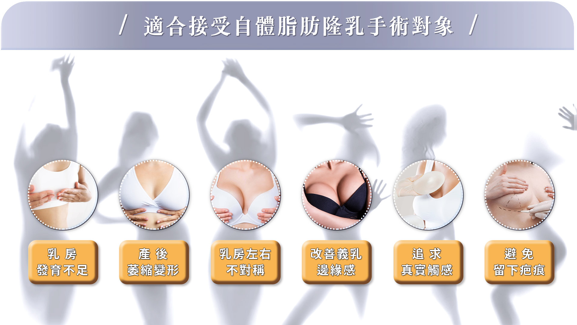 自體脂肪移植隆乳不以假體材料作為填充物,免去身體排斥現象與觸感人工不自然的可能性,然而並非人人都適合作此種隆乳手術,BMI值過低、健康不佳、骨架太大、肌肉很多、系統疾病皆不適合抽脂。
