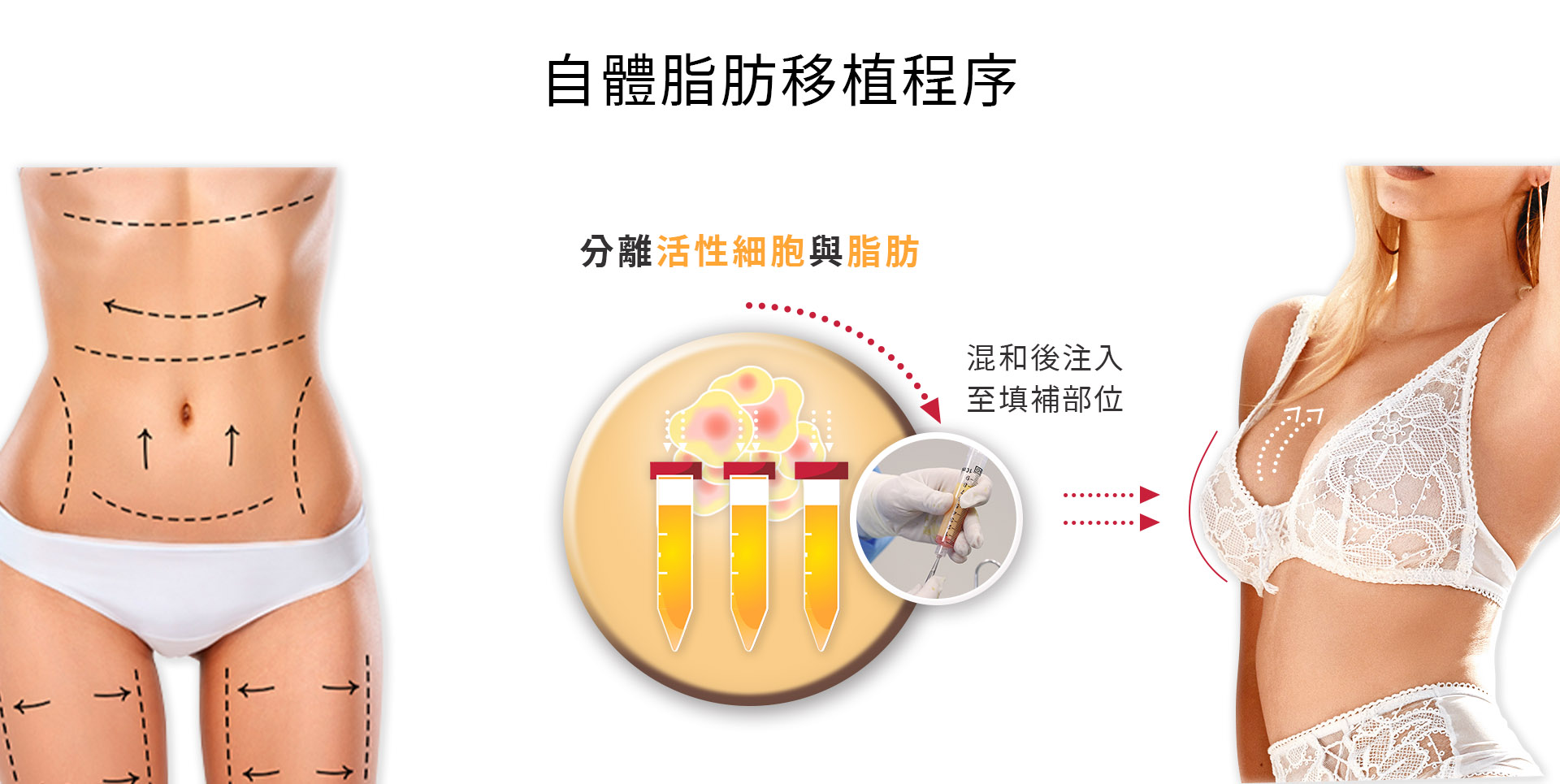 而自體脂肪移植的方法是將抽脂手術所得到的脂肪,經過提純處理後再經注射填補至所需的部位。因植體是使用自身的脂肪,並不會有排斥的問題,而注射後的脂肪細胞在重新建立血液循環後,就會永久存活。