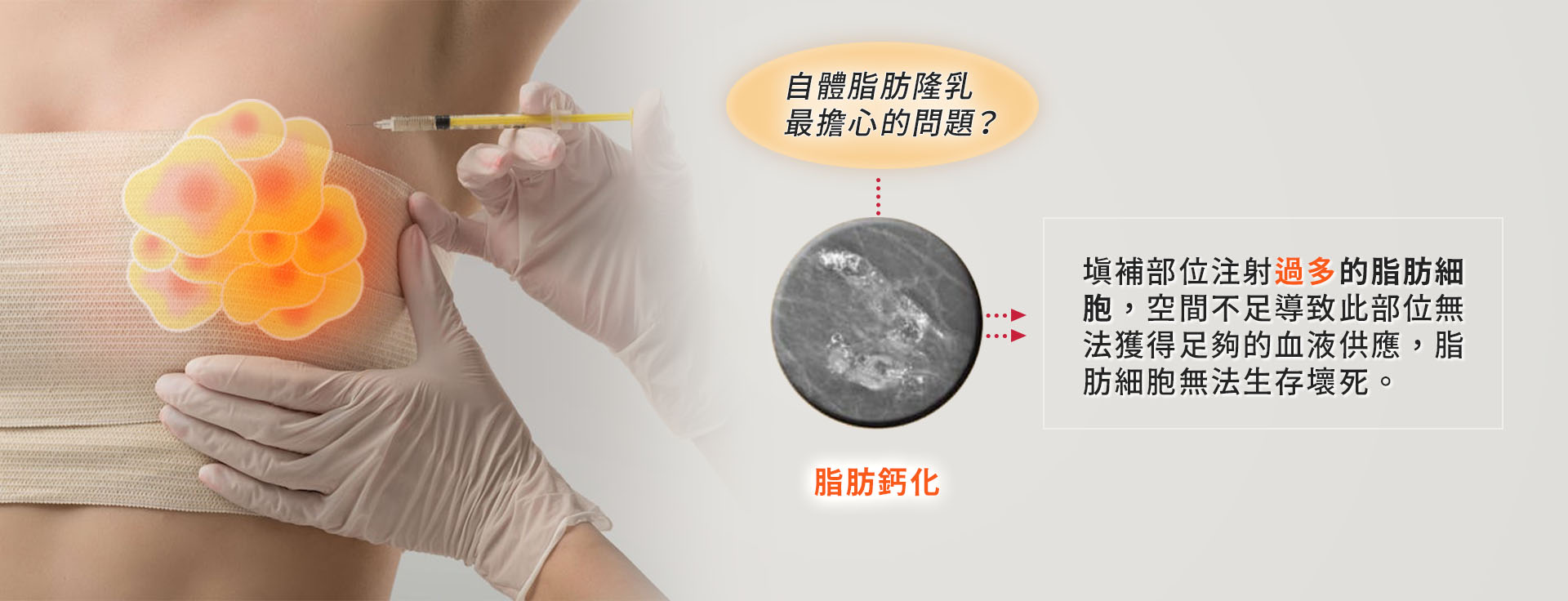 自體脂肪的鈣化:脂肪鈣化是做自體脂肪隆乳的病患最擔心的,透過適量的自體脂肪注射,可以降低鈣化和硬塊形成的風險,因為脂肪注射需要均勻分布以確保脂肪存活。然而,若注射過多的脂肪且無法獲得足夠的血液供應,就容易導致鈣化、硬塊或囊腫等症狀的形成。因此,有經驗的醫生會評估每次手術時所需的適量注射,而不是盲目地追求罩杯大小而過度注射,畢竟,自體脂肪隆乳手術後若出現硬塊,有時很難區分是增生還是癌症前期的症狀,這可能會讓患者感到擔憂和不安。