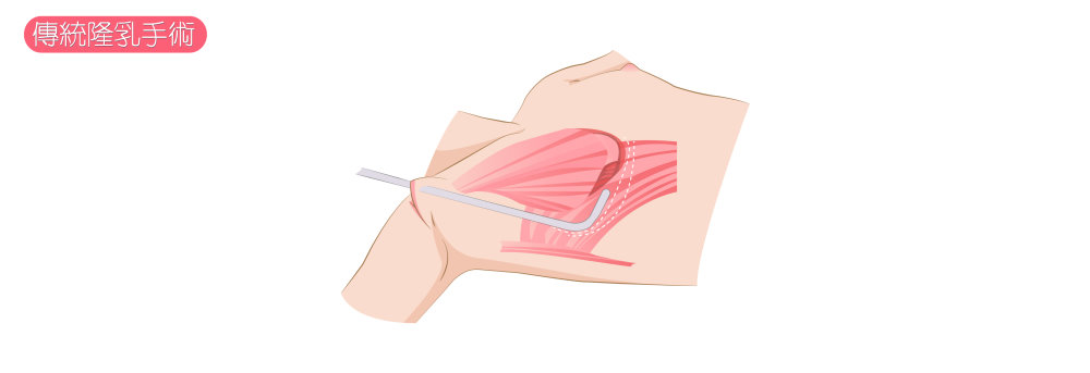 傳統隆乳手術的作法,是用一隻如同鍋鏟的金屬剝離器,由腋下切口伸入胸大肌下方,盲目地以暴力將胸大肌下緣和肋骨之間的附著點剝離,製造出一個適當大小、有如口袋的胸肌下空間之後,再將義乳植入。