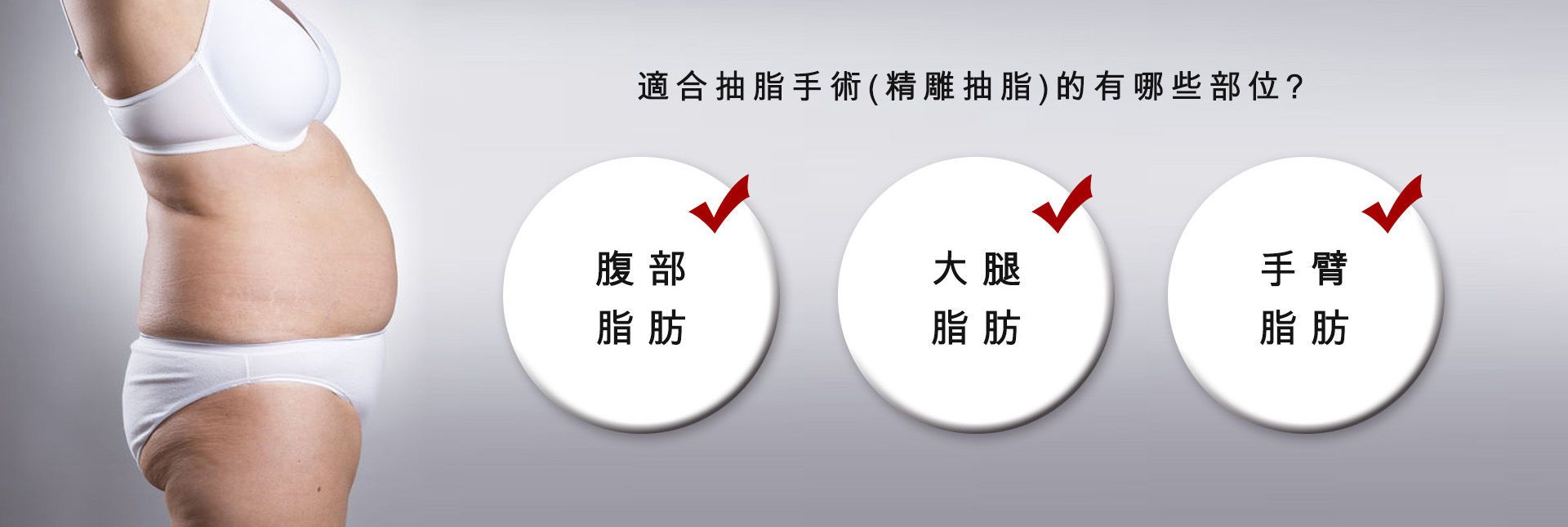 適合抽脂的部位:全身局部或面積較大的部位。例如:下巴、腹部、腰側、背部、腿部、臀部及手臂(蝴蝶袖)